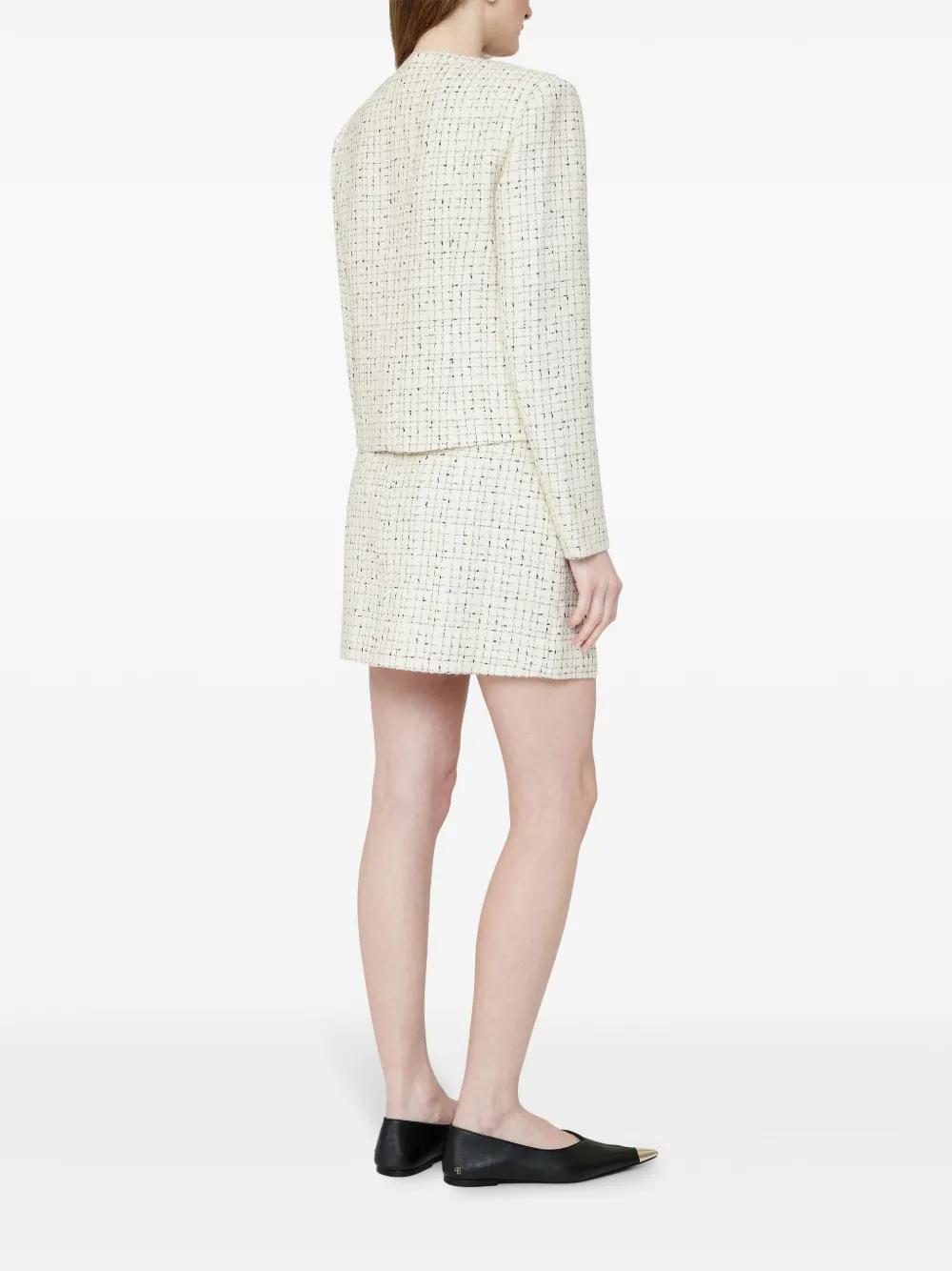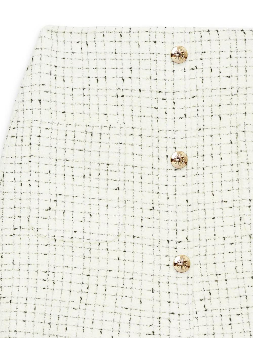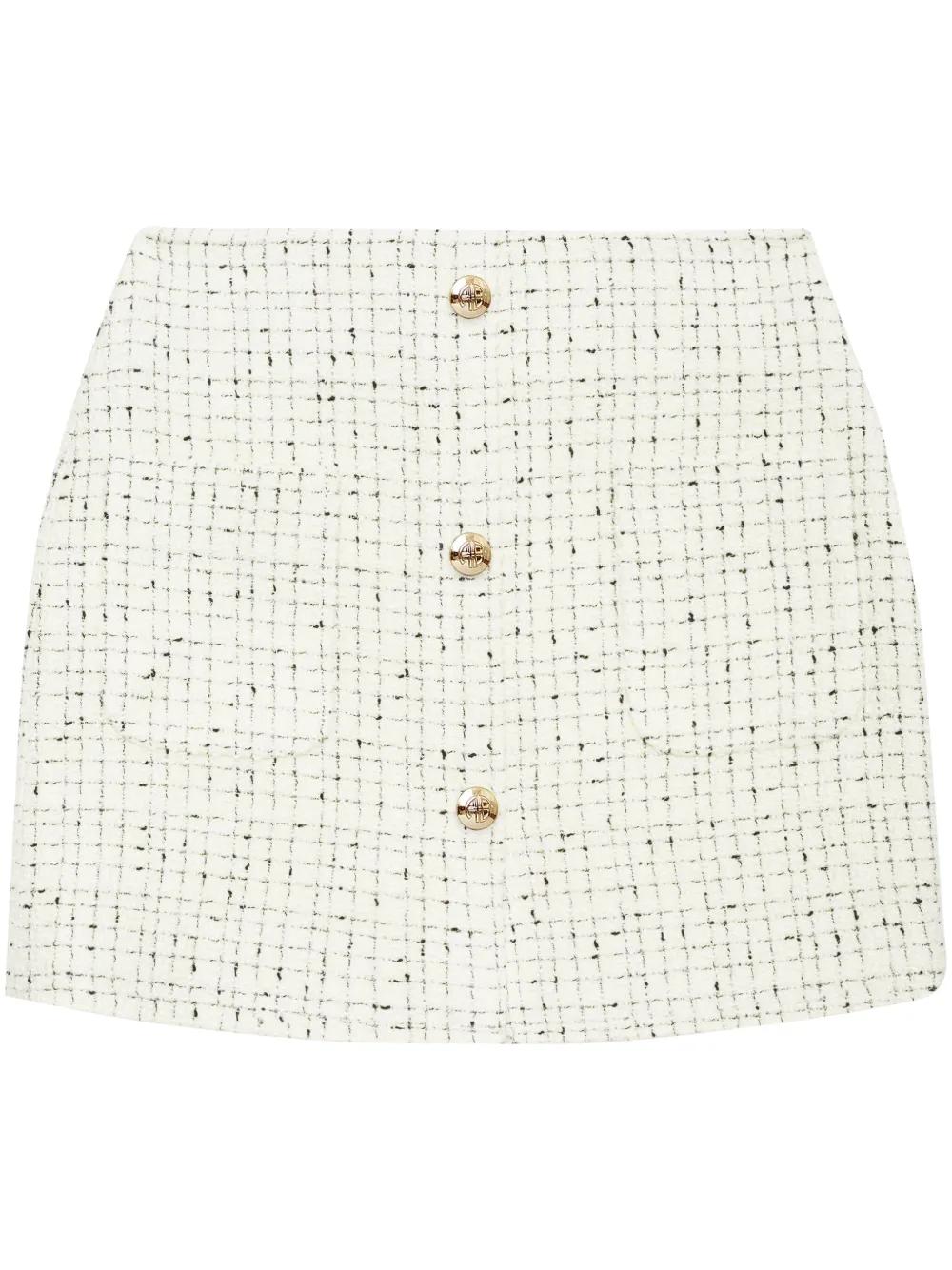 white/black tweed bouclé construction check pattern metallic threading decorative button detailing high-waisted concealed rear hook and zip fastening logo-embossed buttons two front patch pockets straight hem above-knee length logo-jacquard lining