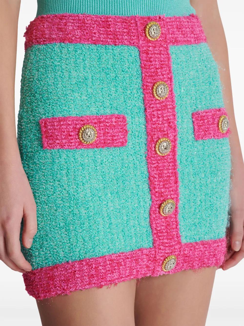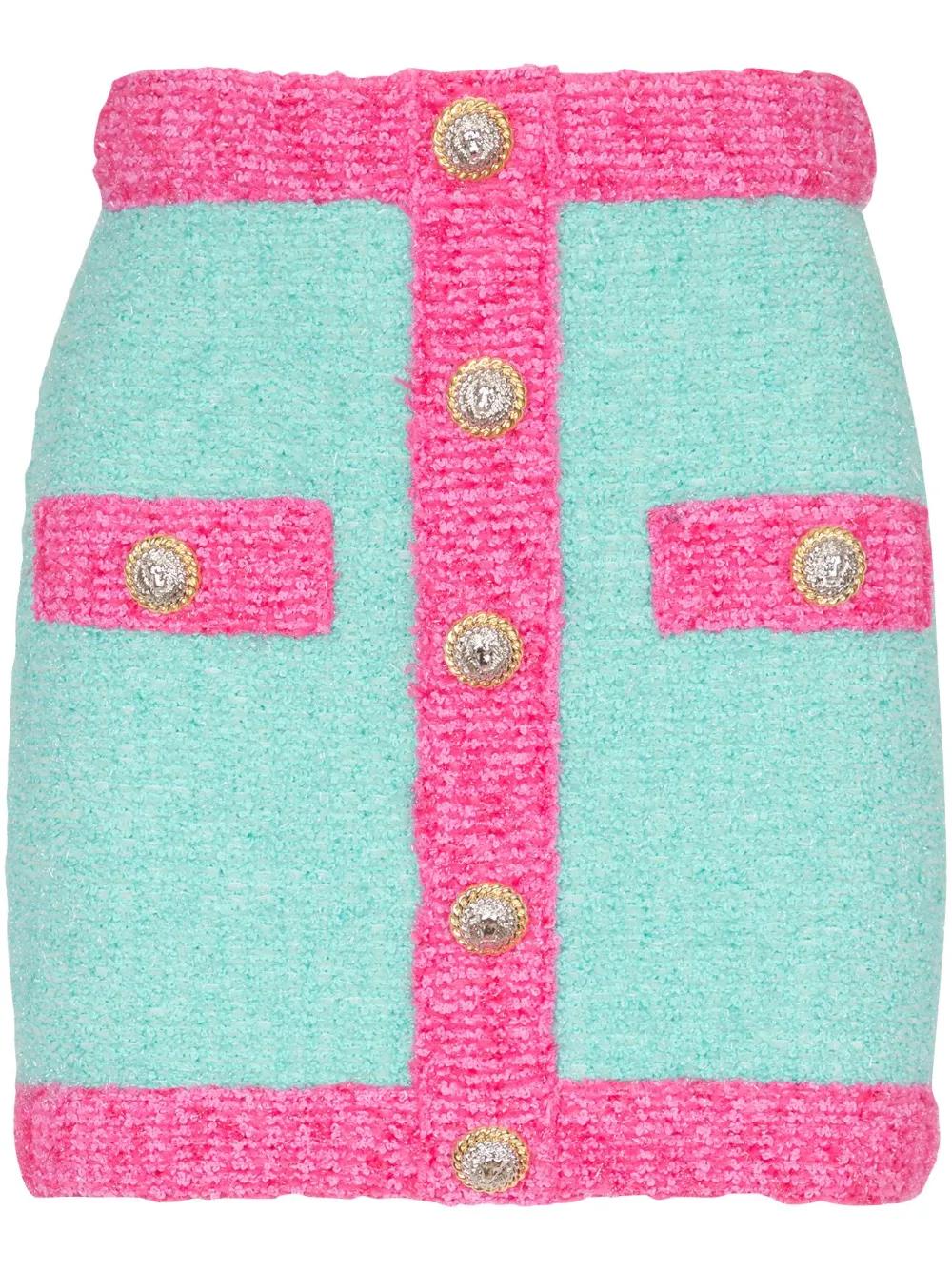 blue/pink bouclé construction decorative button detailing rear zip fastening faux pocket detail thigh-length straight hem