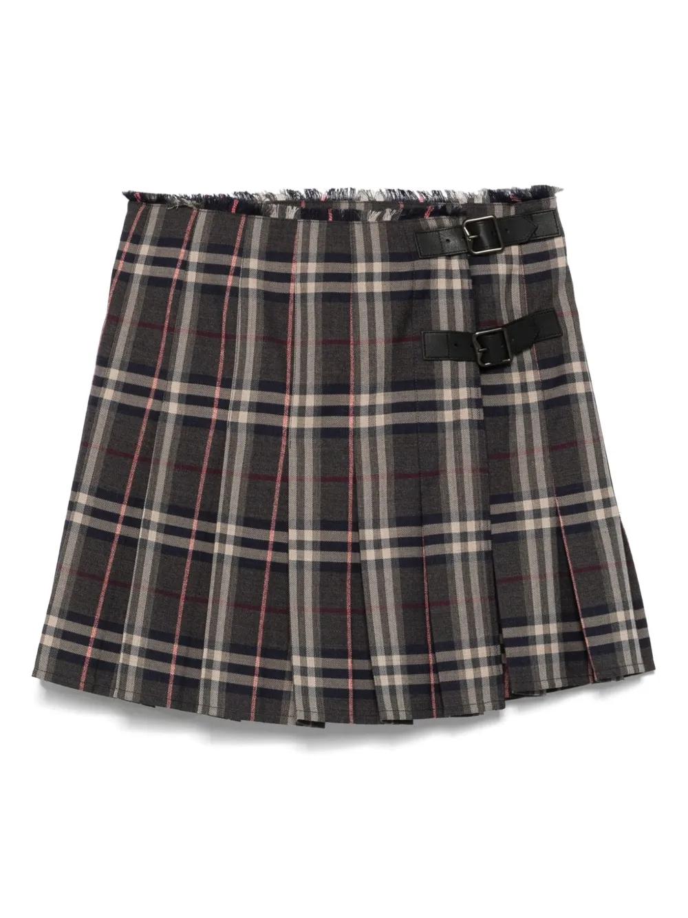 dark grey side buckle fastening fully pleated check pattern thigh-length