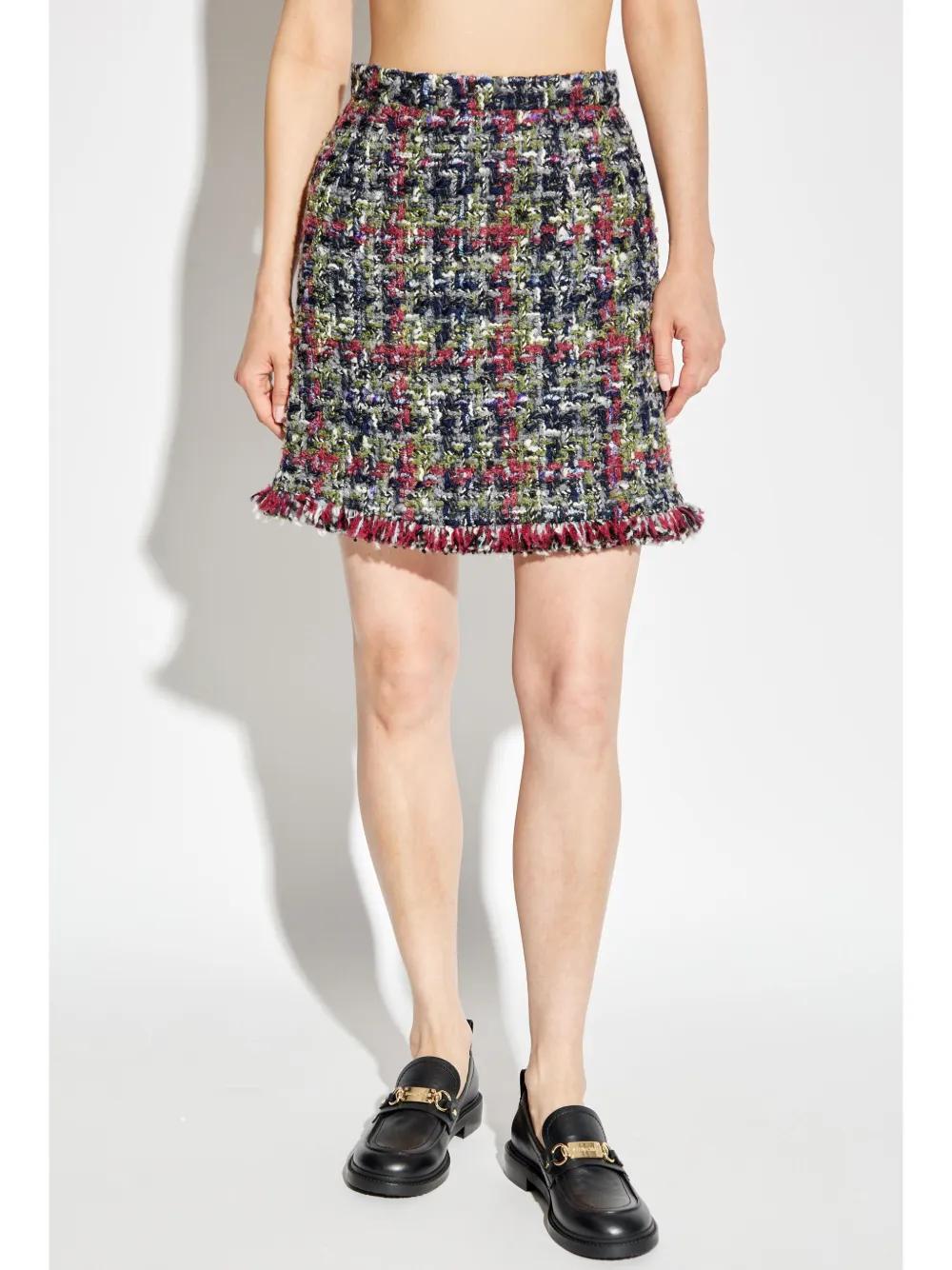 black/red/multicolour wool blend check pattern tweed bouclé design mid-rise concealed side zip fastening fringed edge straight hem above-knee length