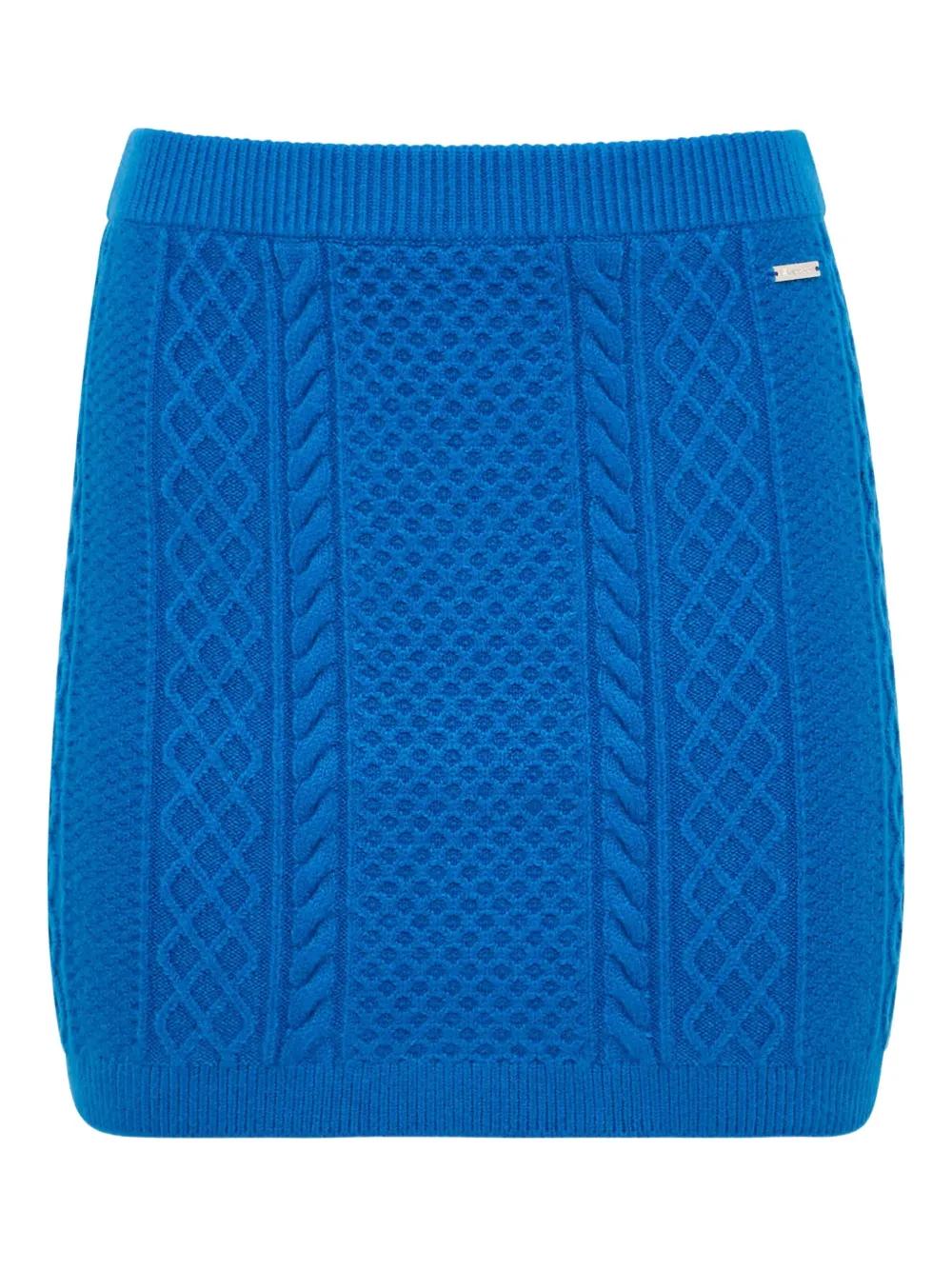 bright blue cable knit ribbed waistband straight hem textured pattern mini length