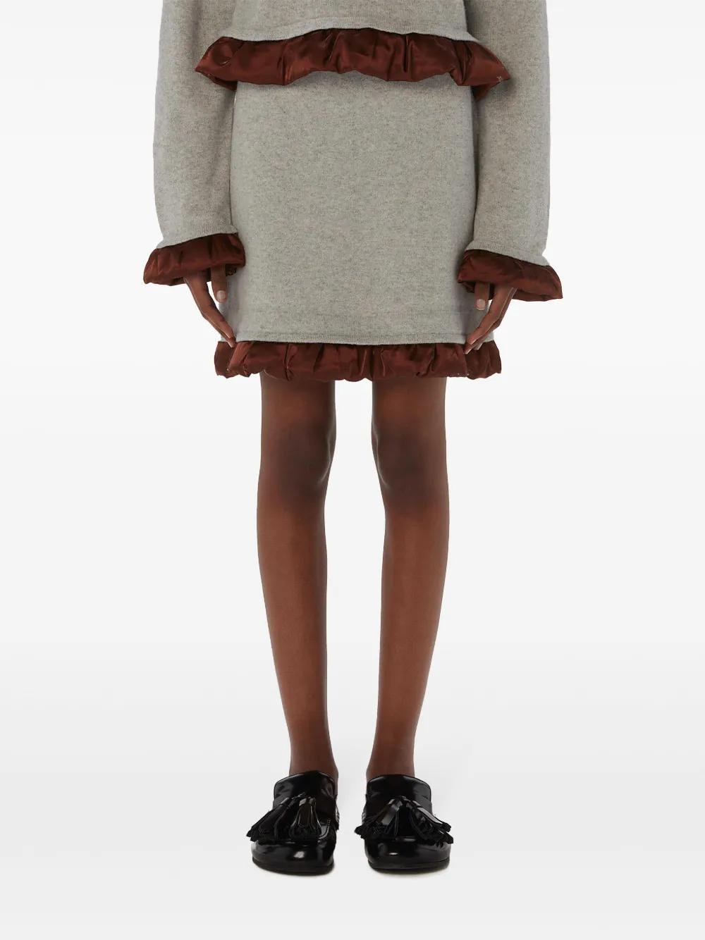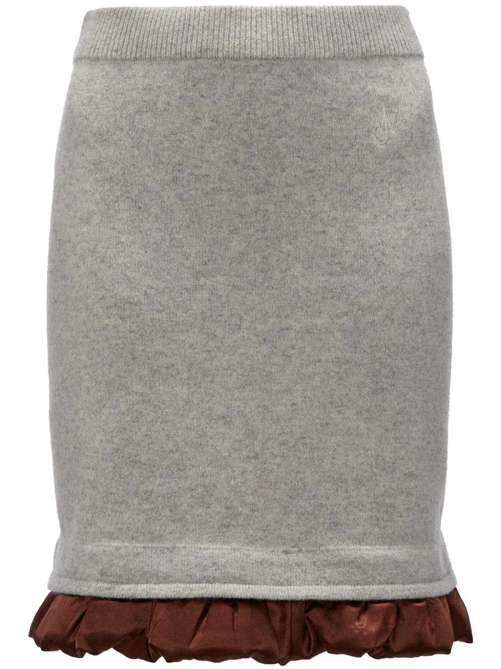 light grey/chocolate brown merino wool knitted construction signature JW-initials anchor logo gathered detailing contrasting trim satin trim high-waisted ribbed waistband ruffle hem above-knee length