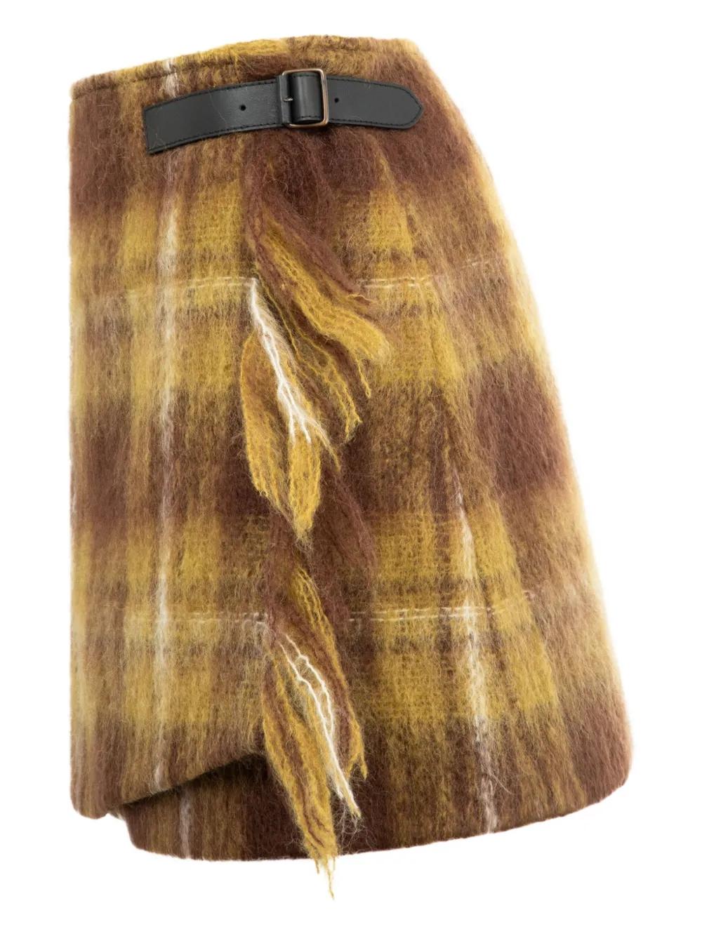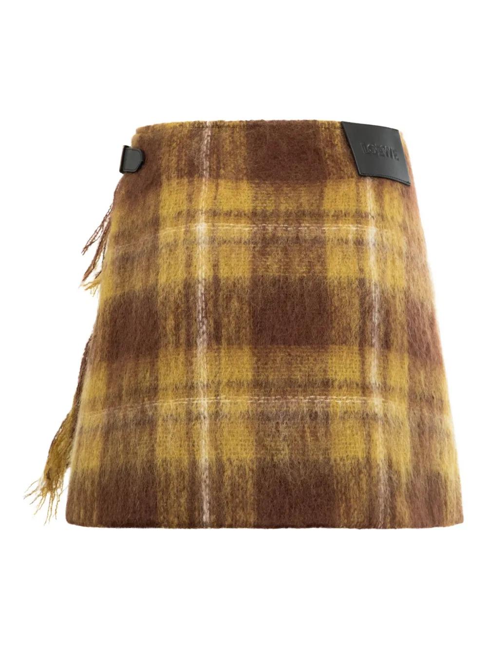 brown plaid pattern fringed detail buckle fastening leather logo patch