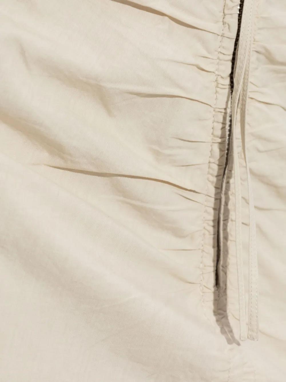 light beige front zip fastening ruched detailing ruffle hem thigh-length