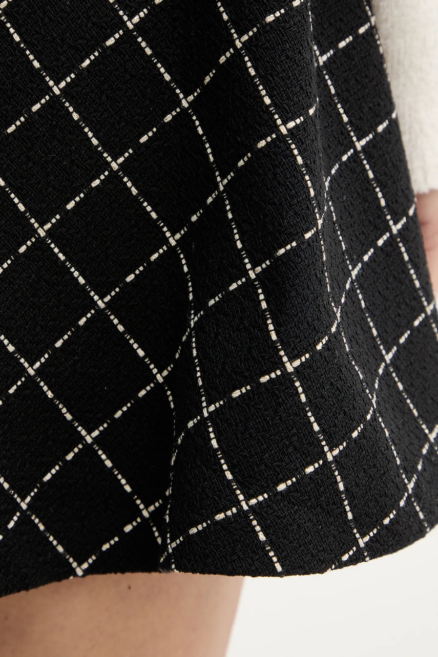 - Rozkloszowany fason. - Dodatkowa warstwa materiału w postaci podszewki. - Materiał z metaliczną nicią. - Zapięcie na kryty suwak. - Szerokość w pasie: 32 cm. - Długość: 45 cm. - Wymiary podane dla rozmiaru: 36.