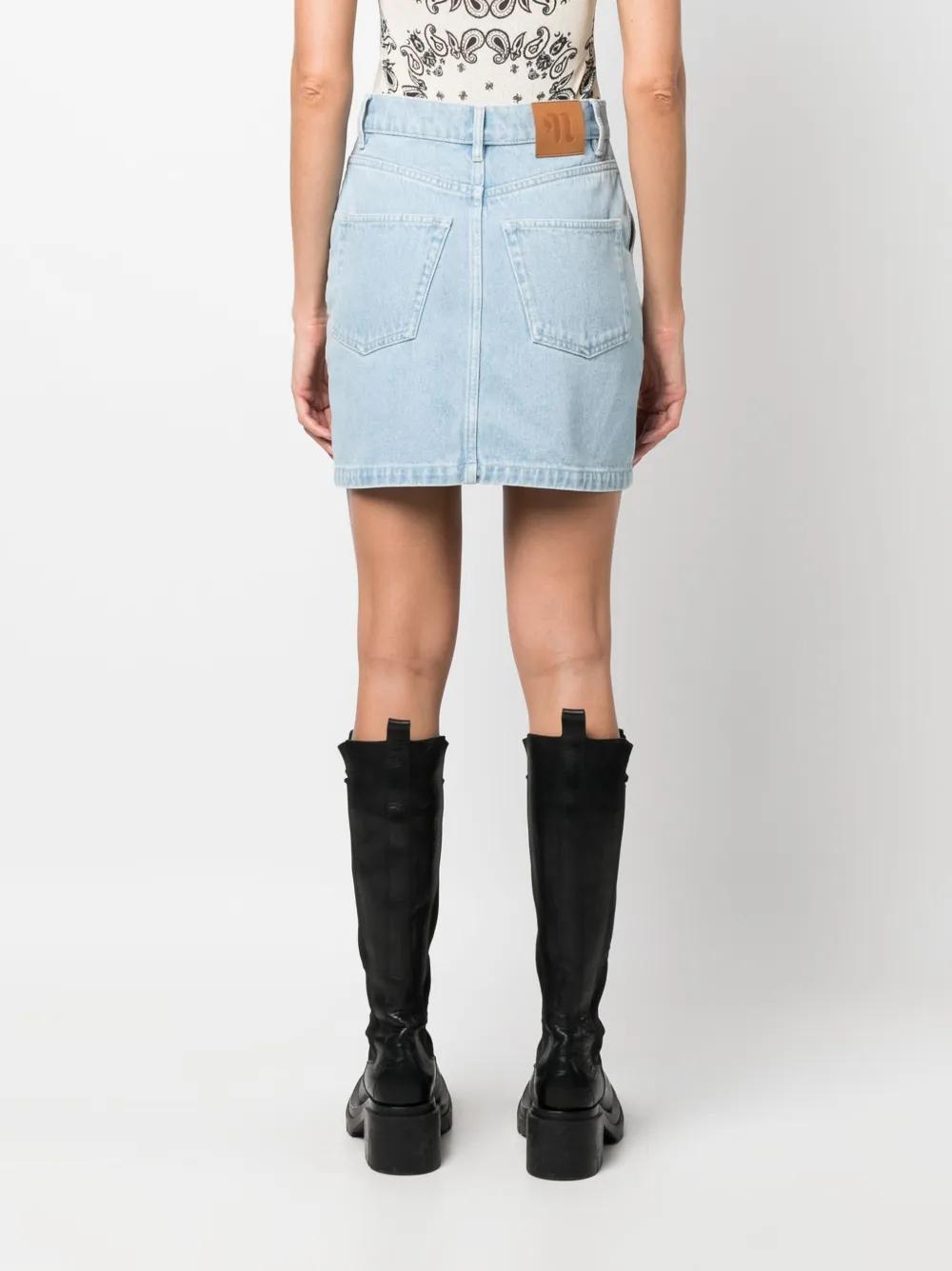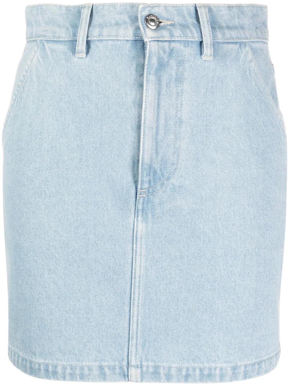 light blue organic cotton high waist belt loops concealed fly and button fastening classic five pockets logo patch to the rear thigh-length straight hem