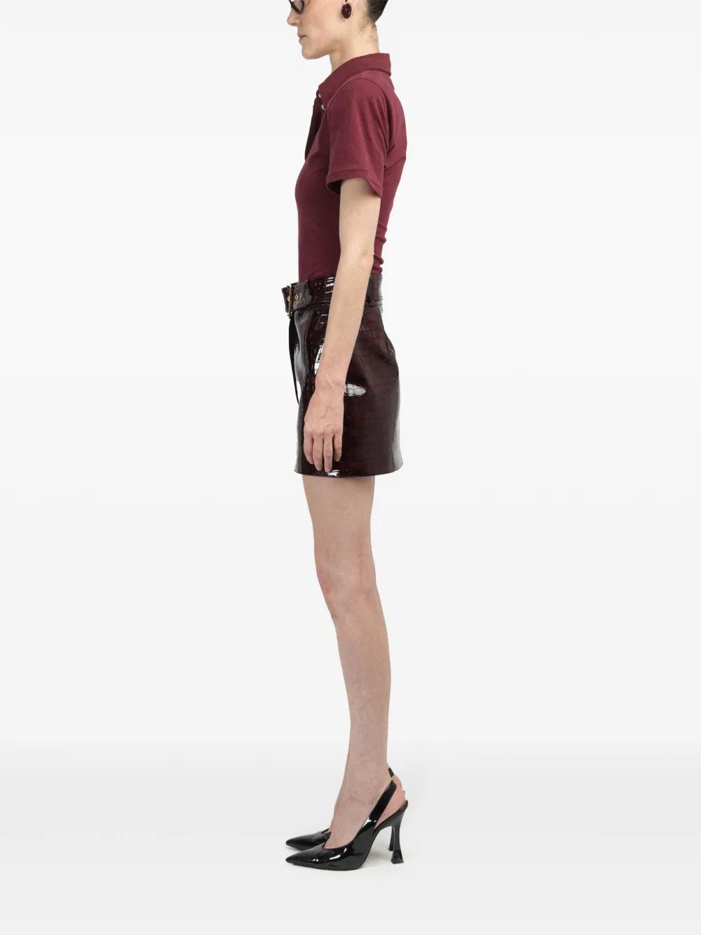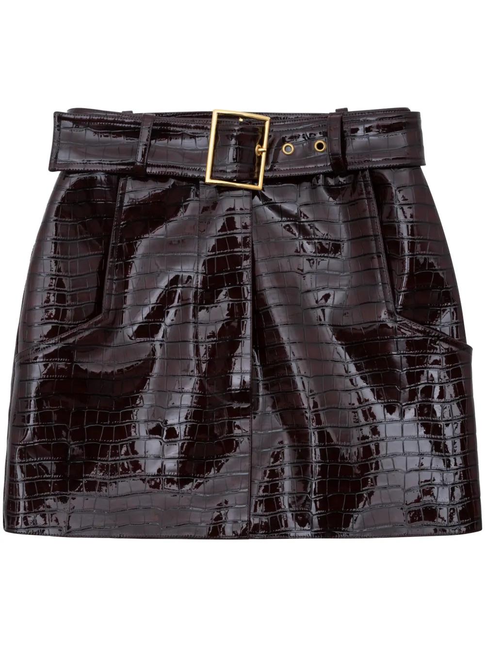 bordeaux red embossed crocodile effect patent finish belted waist belt loops straight hem thigh-length
