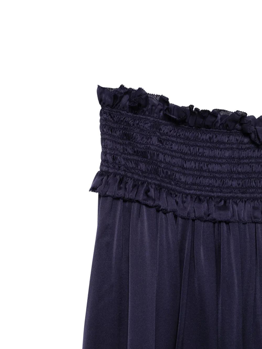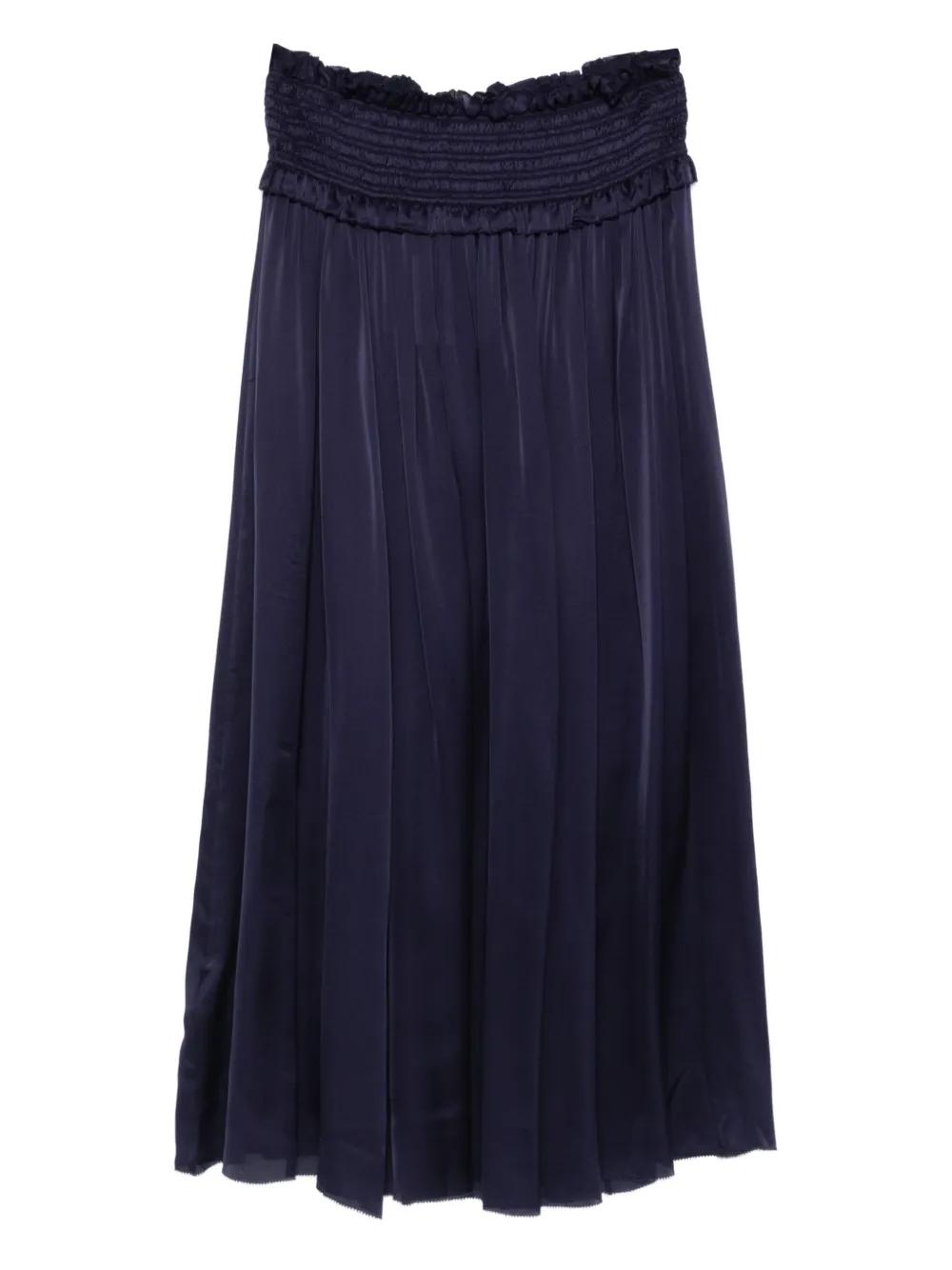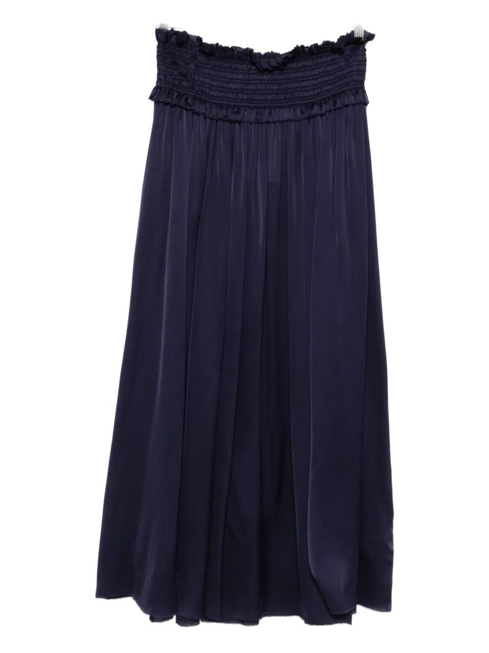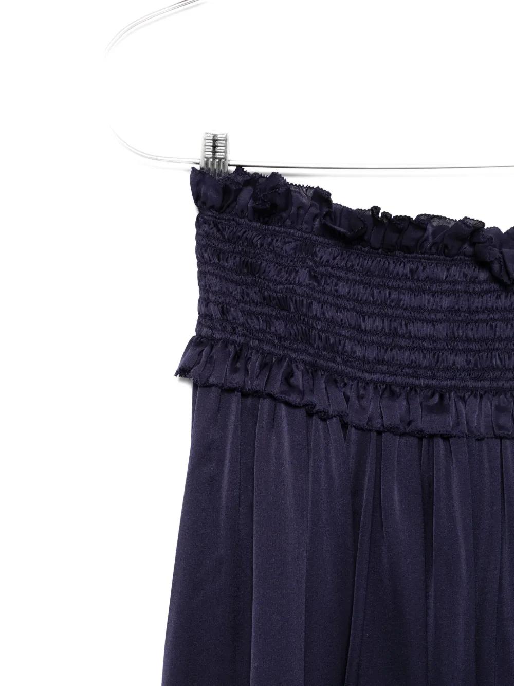 navy blue silk shirred waistband ruffled trim tonal stitching straight hem