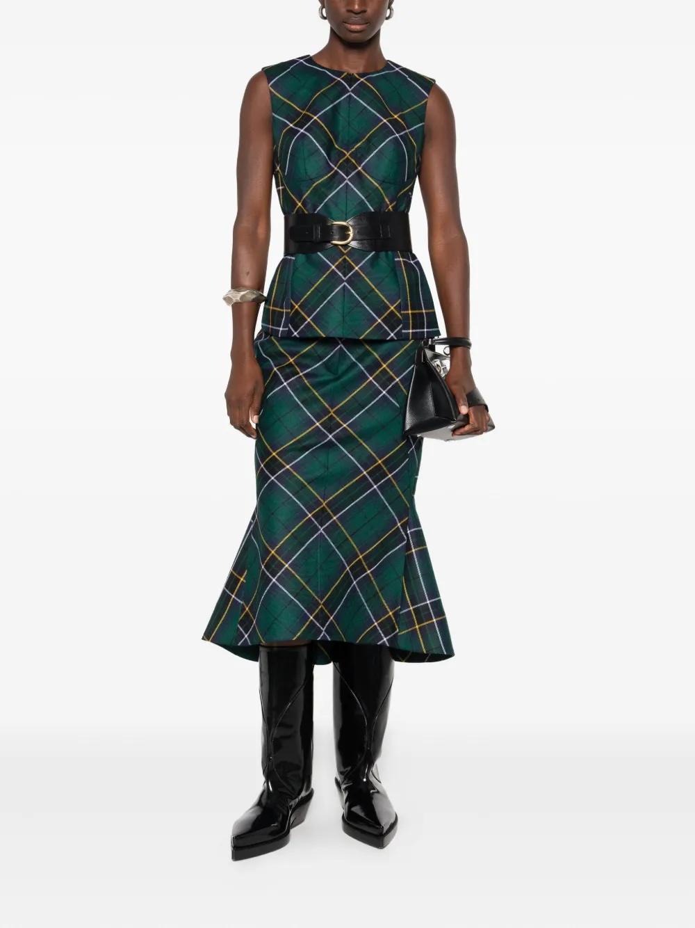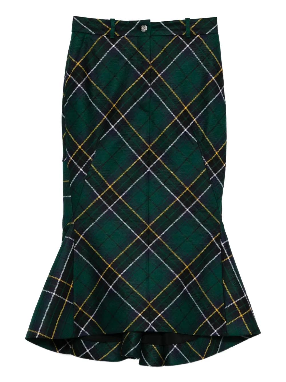 dark-green plaid-check pattern flared hem high waist wool button fastening