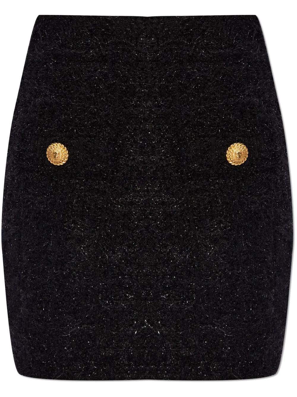 black bouclé construction mélange effect embossed gold-tone buttons high-waisted rear zip fastening pencil design thigh-length straight hem