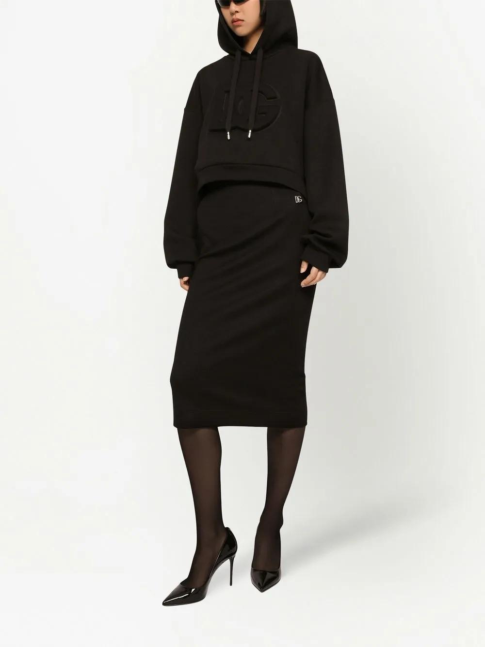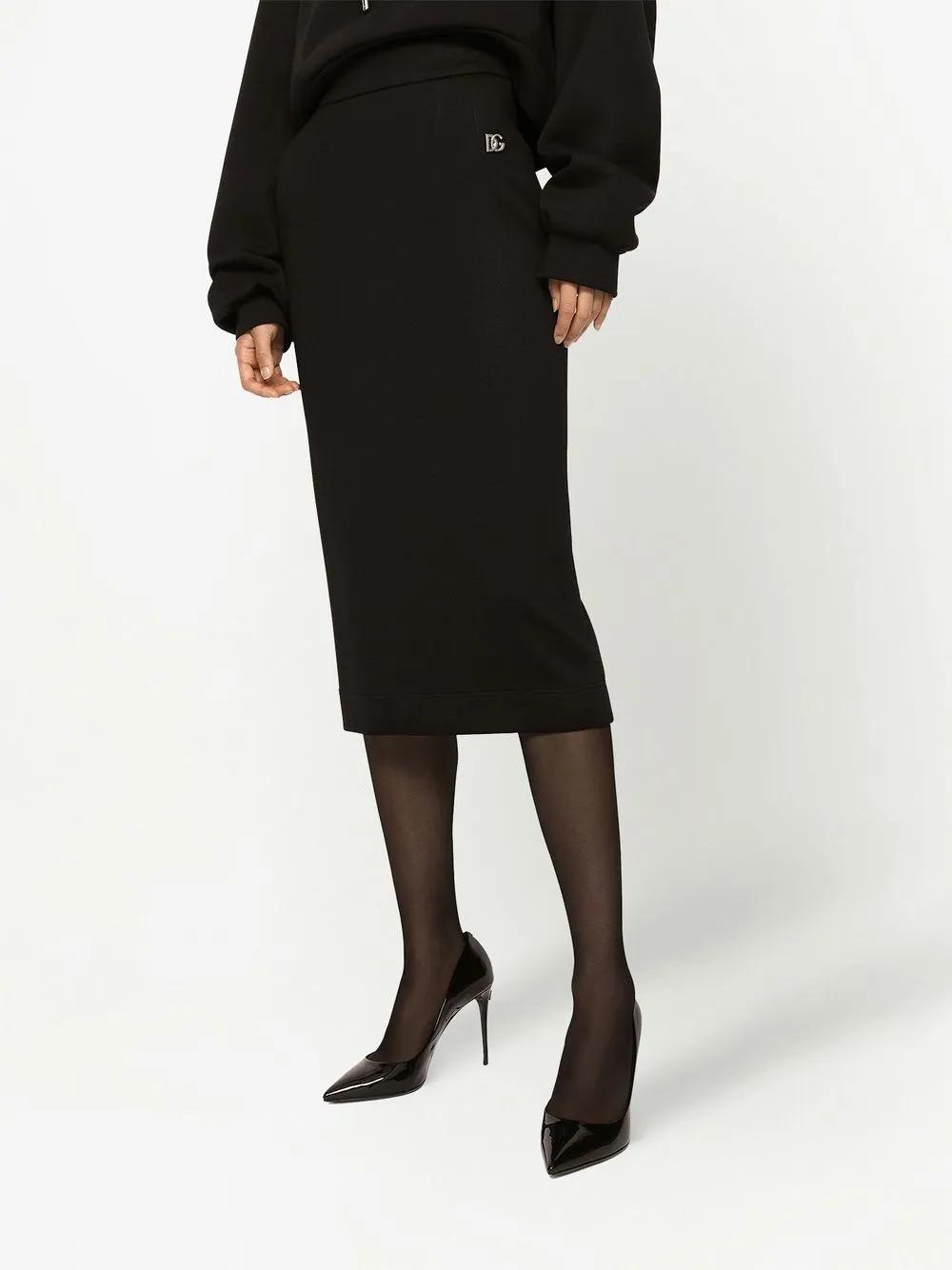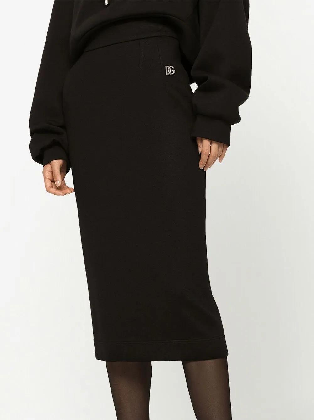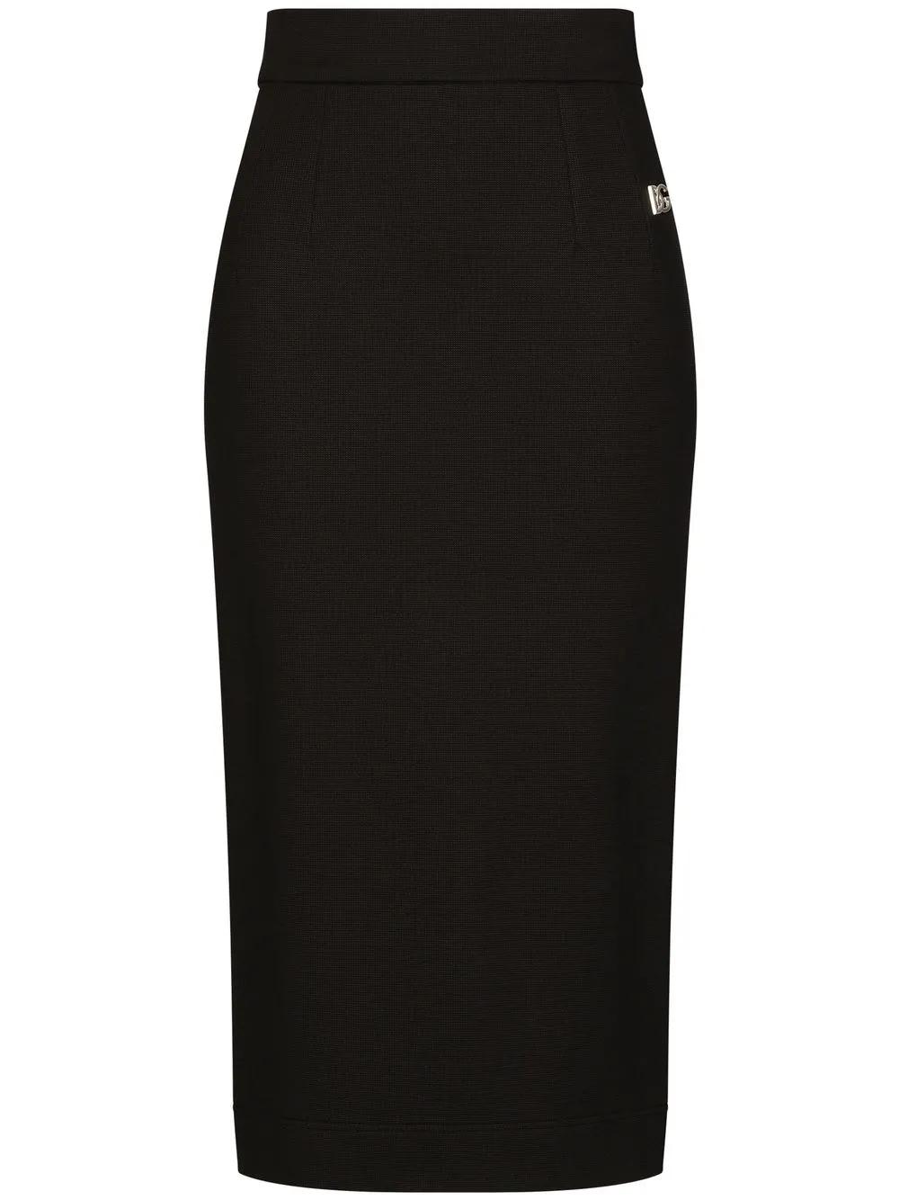 logo-plaque pencil midi skirt from DOLCE & GABBANA featuring black, stretch-design, pencil silhouette, knee-length, high-waisted, silver-tone logo plaque and rear zip fastening.