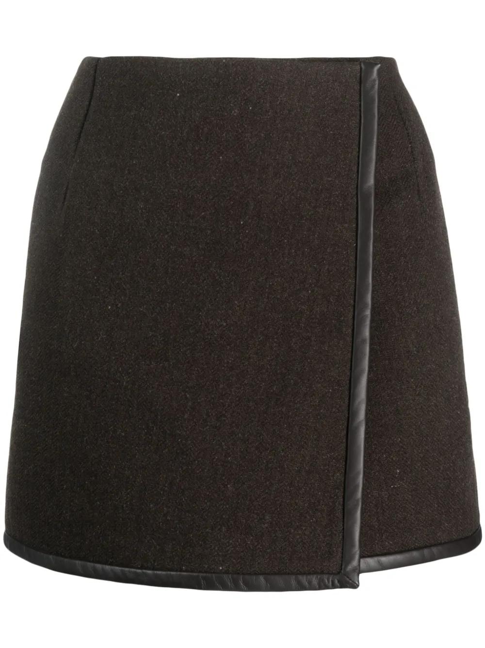 cedar brown virgin wool star stud detailing high waist off-centre front fastening two rear welt pockets leather trim asymmetric hem thigh-length