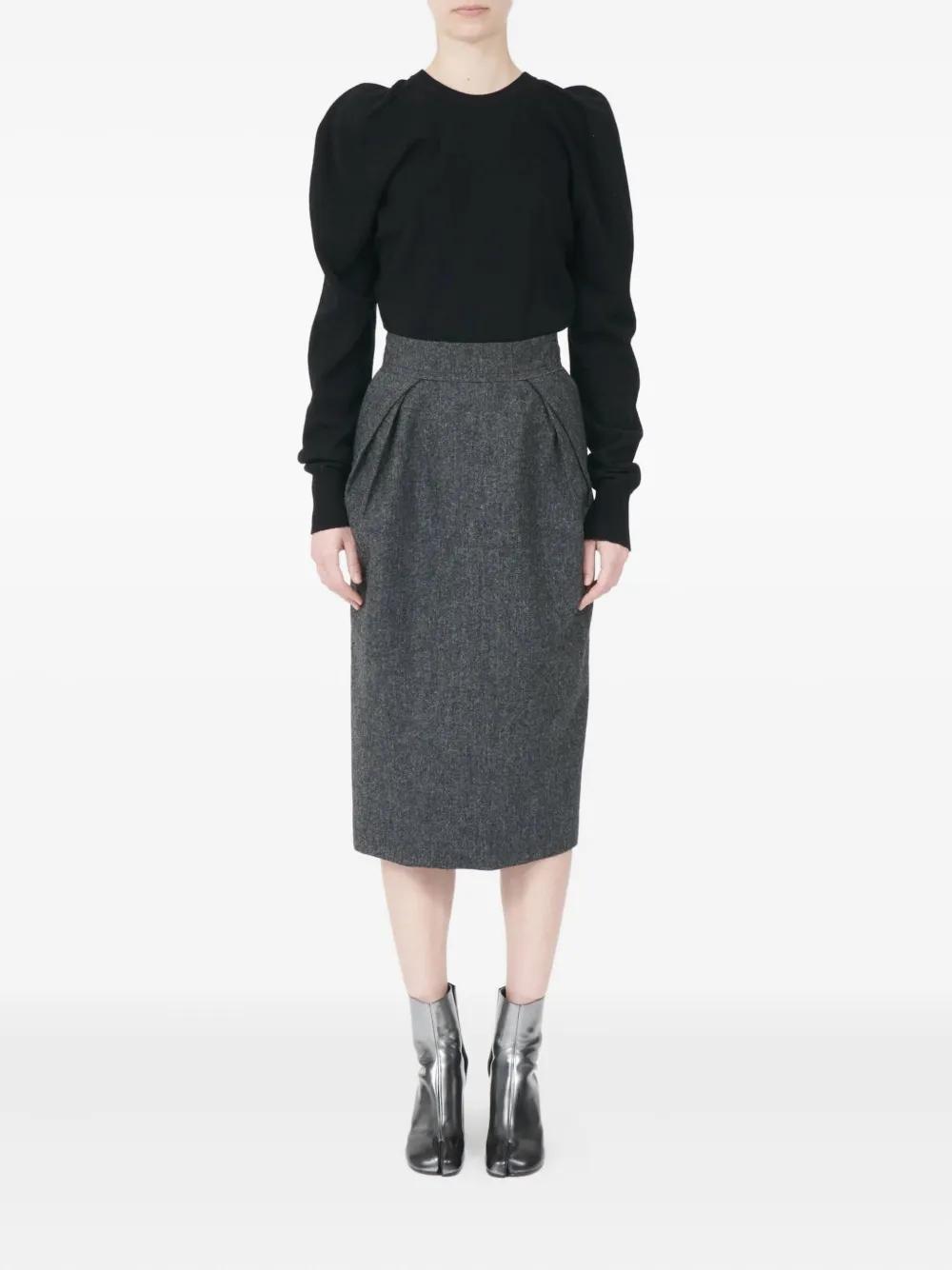 dark grey wool fabric high waist pleated detailing centre back vent straight hem