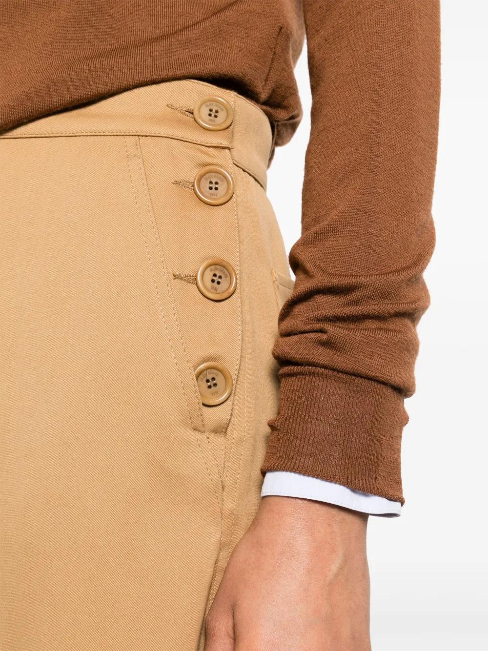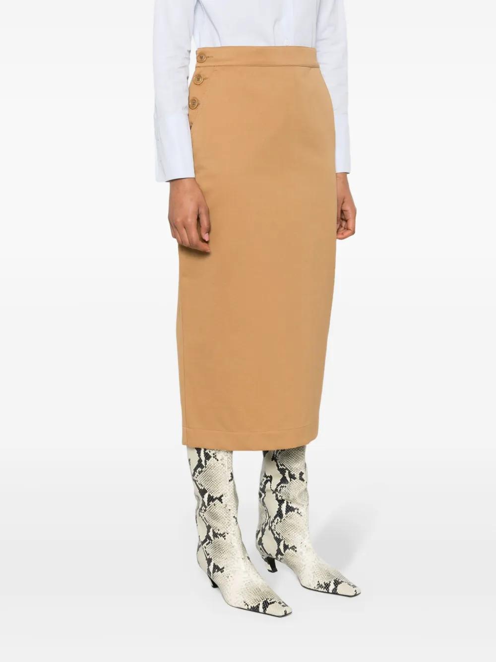chestnut brown cotton two side inset pockets two rear patch pockets rear slit below-knee length unlined side button fastening