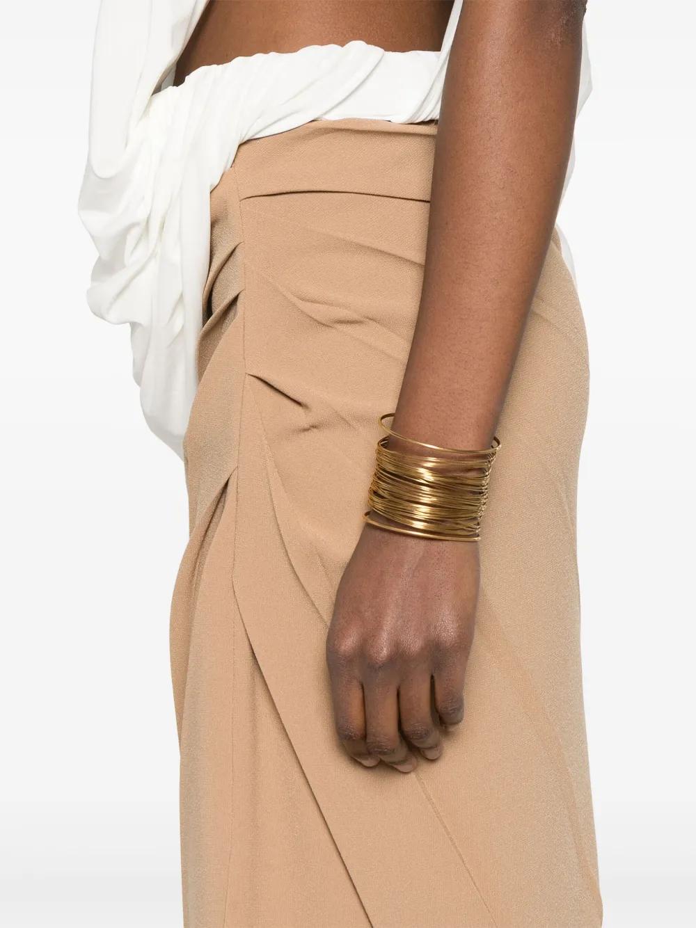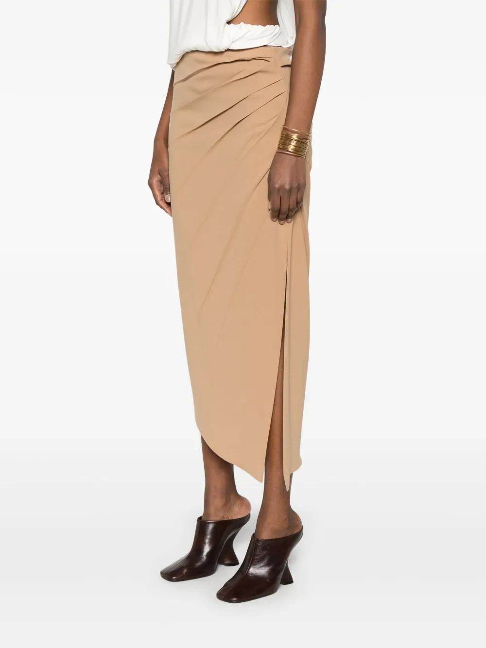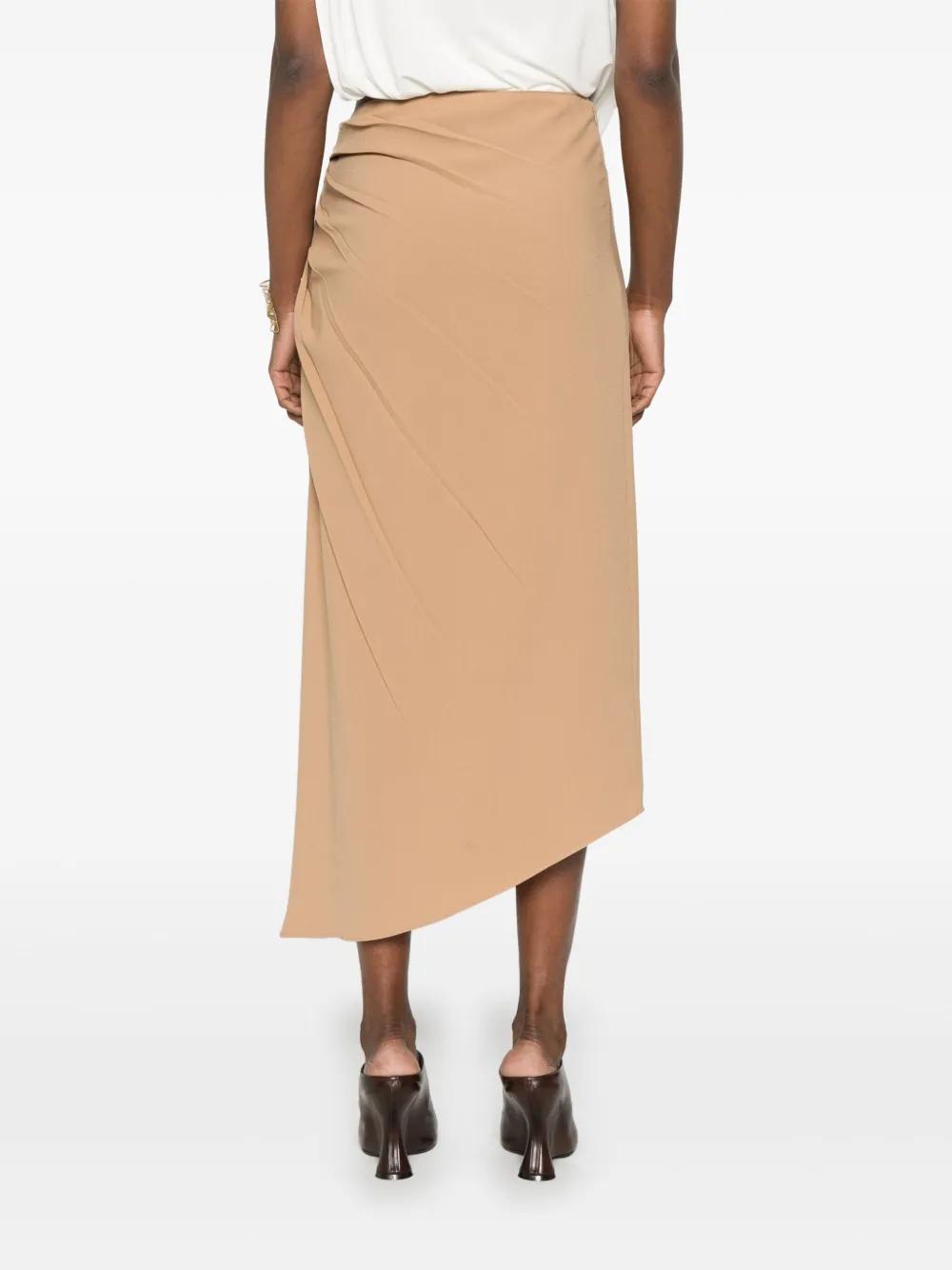light brown concealed side zip fastening side slit ruched detailing asymmetric hem
