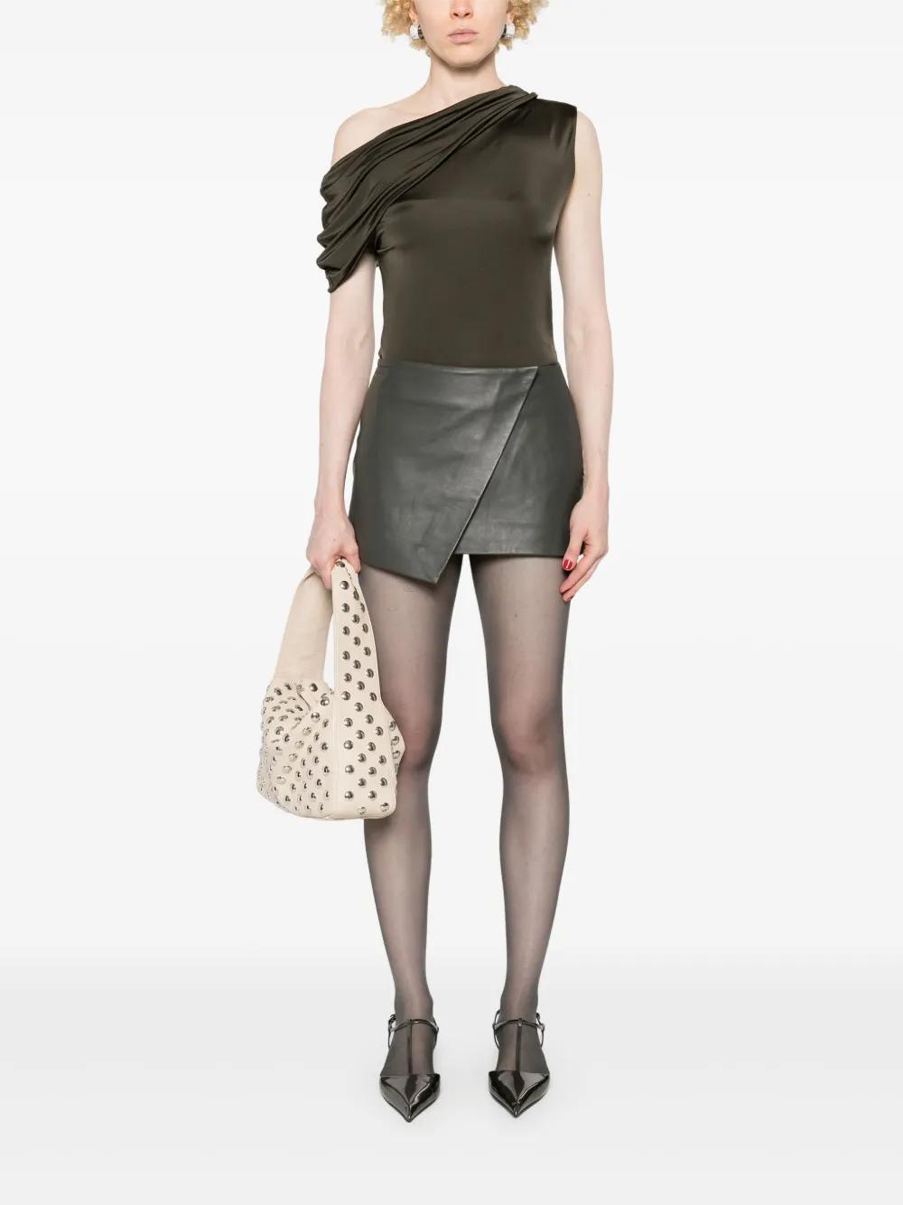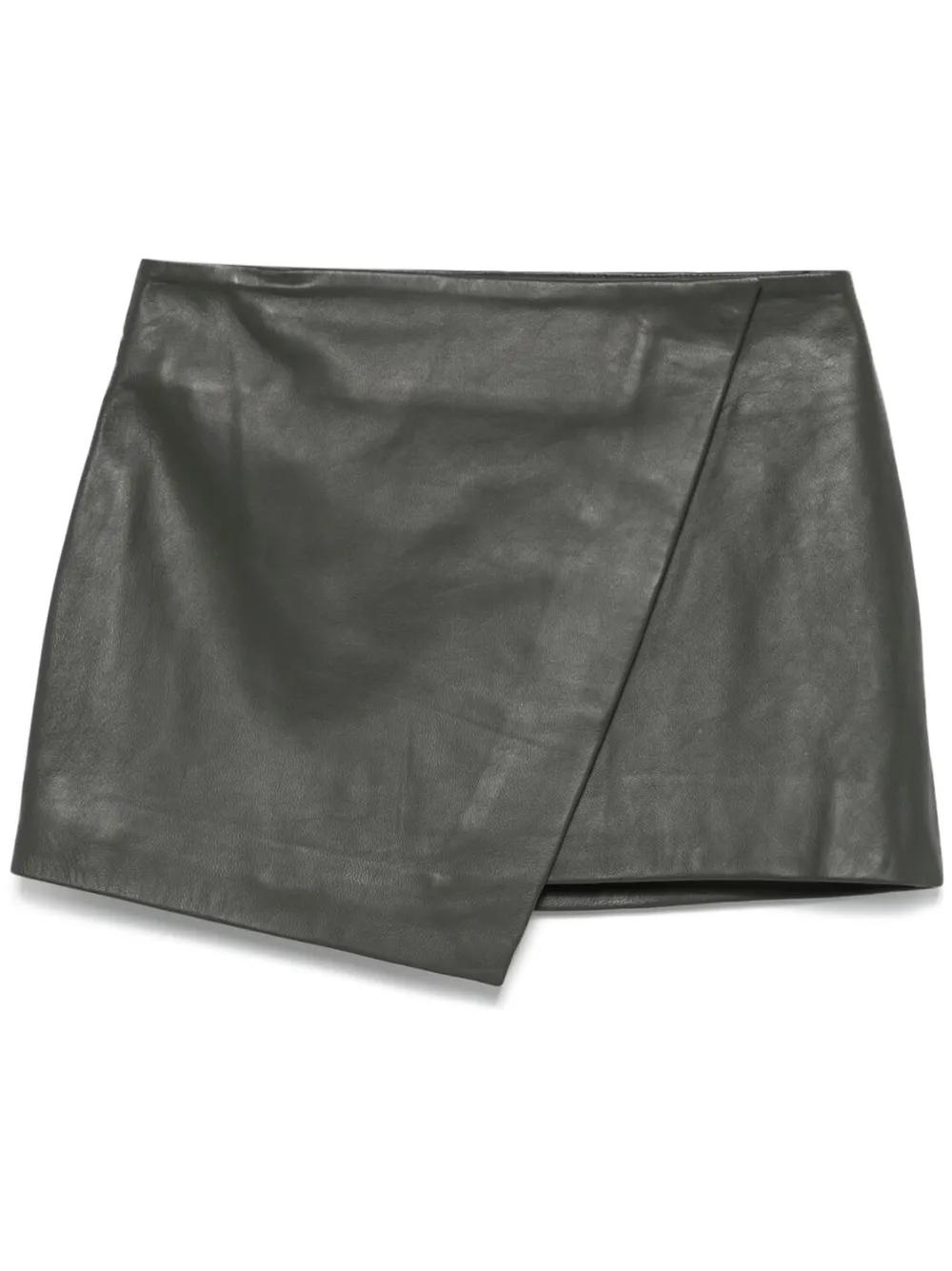 khaki lambskin smooth grain wrap design side hook and eye fastening side button fastening wrap design dart detailing full lining asymmetric hem thigh-length