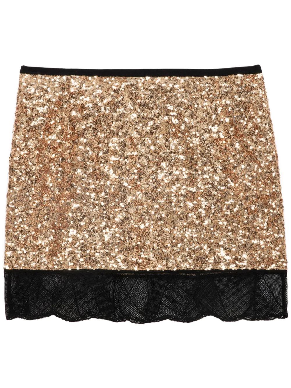 gold-tone/black concealed side zip fastening sequin embellishment lace detailing high-waisted scallop hem above-knee length
