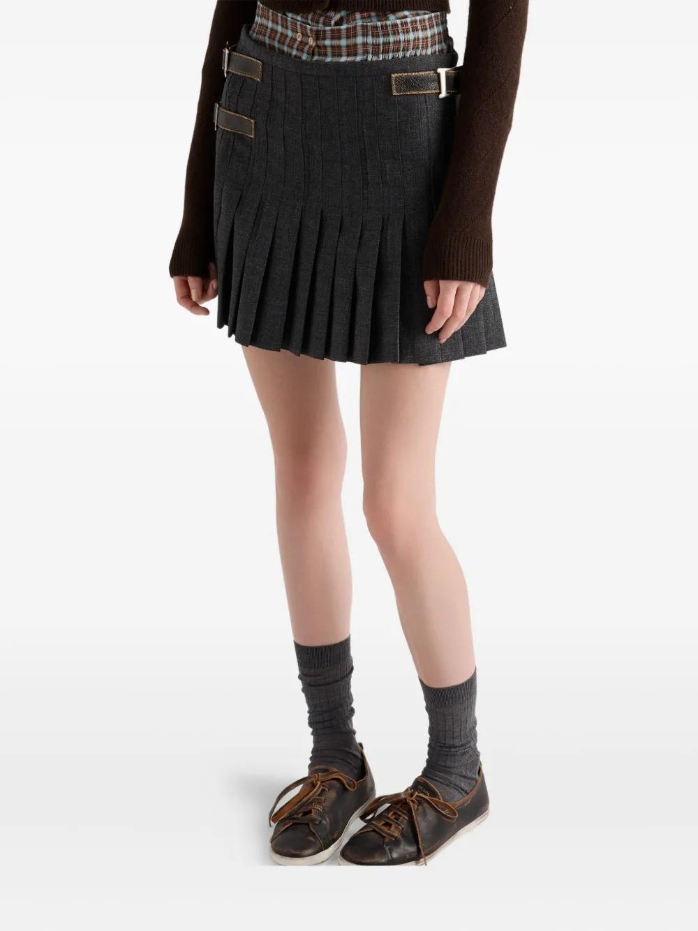 Black wool pleated wrap mini skirt from Alexander McQueen featuring a concealed button fastening and a calf leather waist belt.