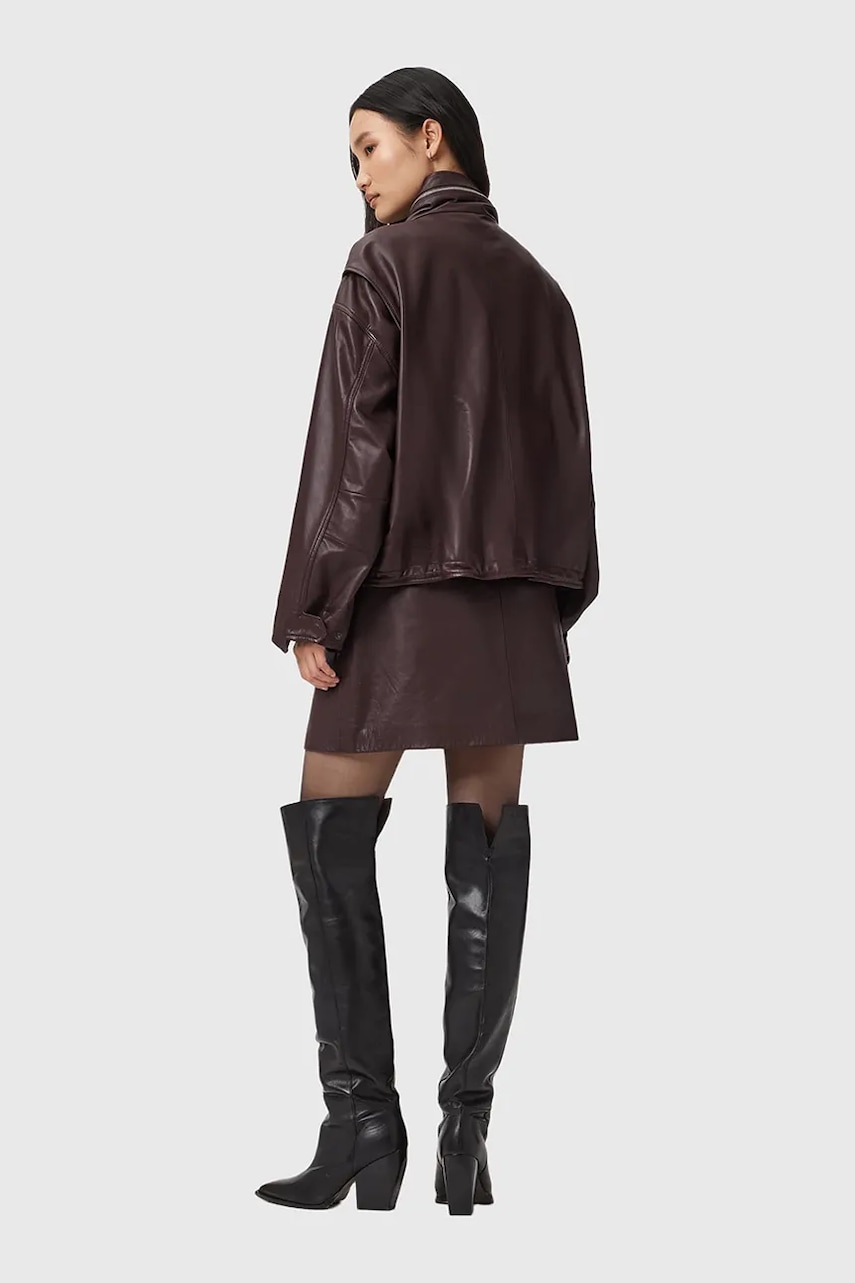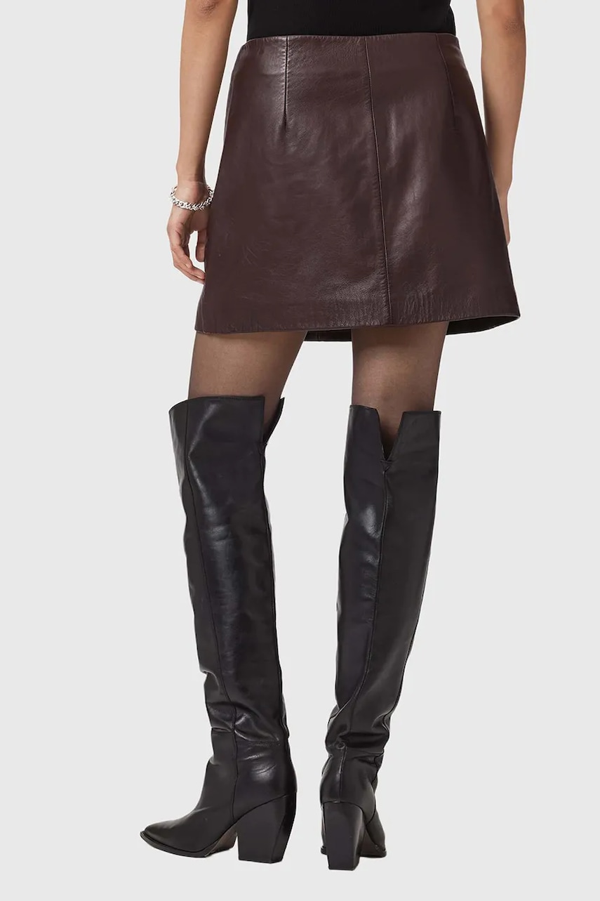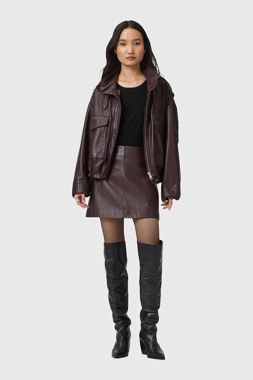 AllSaints spódnica skórzana RENAI kolor bordowy mini rozkloszowana W020RB