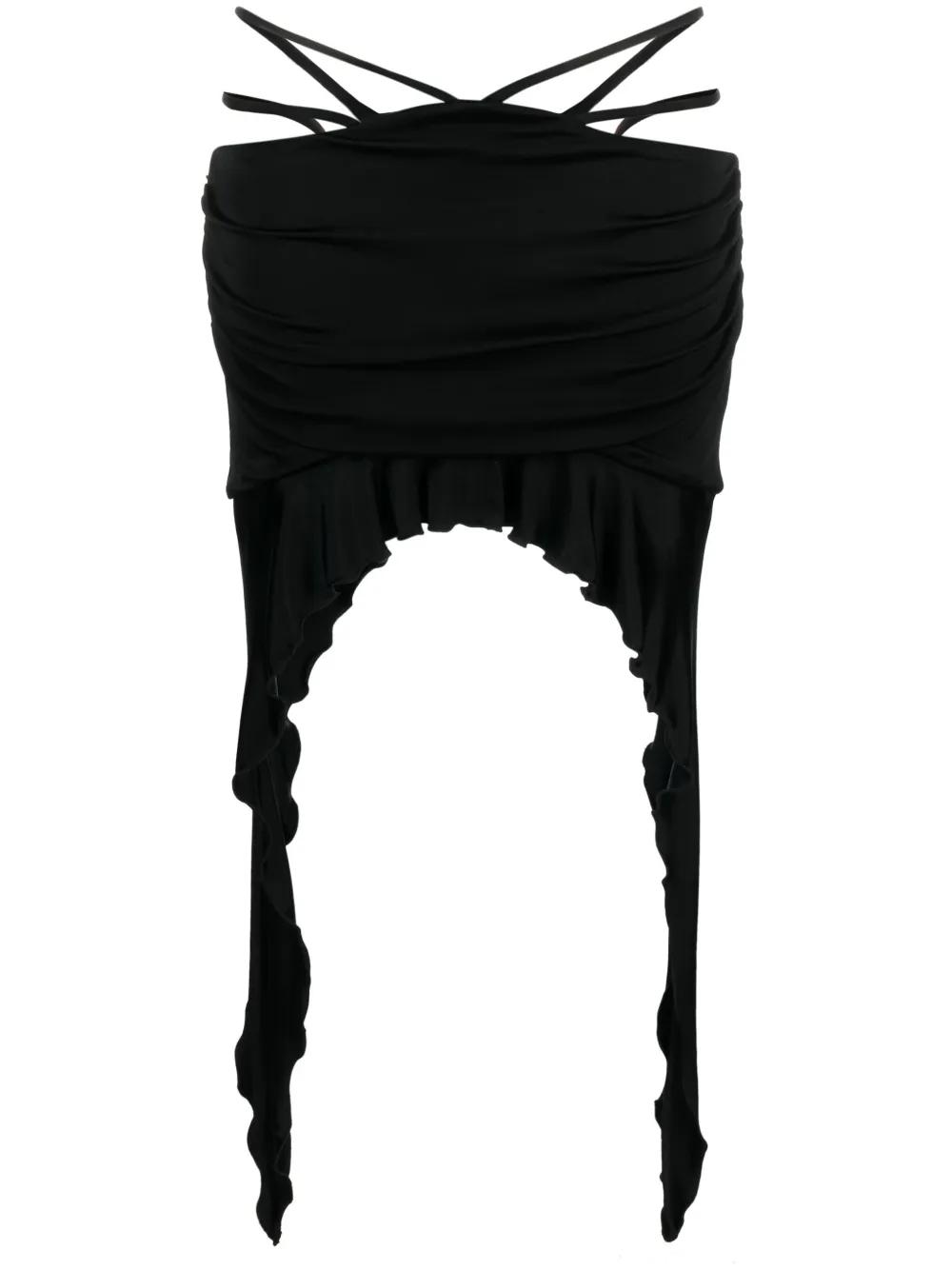 black ruched detailing cut-out detailing draped detailing low-rise concealed rear zip fastening asymmetric hem thigh-length