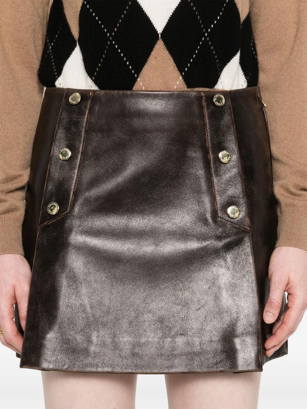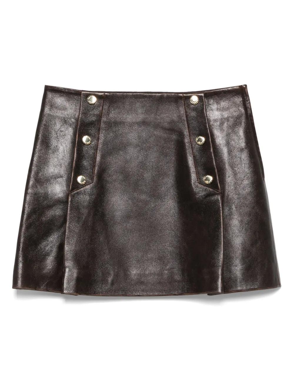 black lambskin buckle-strap fastening hook and zip fly fastening two diagonal pockets to the sides two rear welt pockets unlined straight hem thigh-length