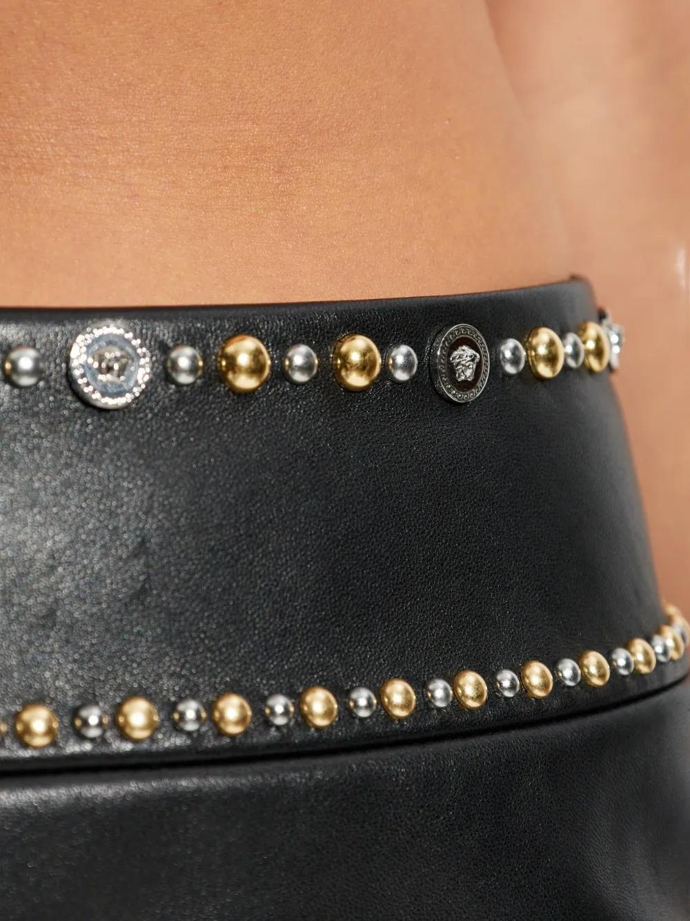 black lambskin smooth grain braid detailing belt loops concealed fly and button fastening two front patch pockets two rear patch pockets thigh-high