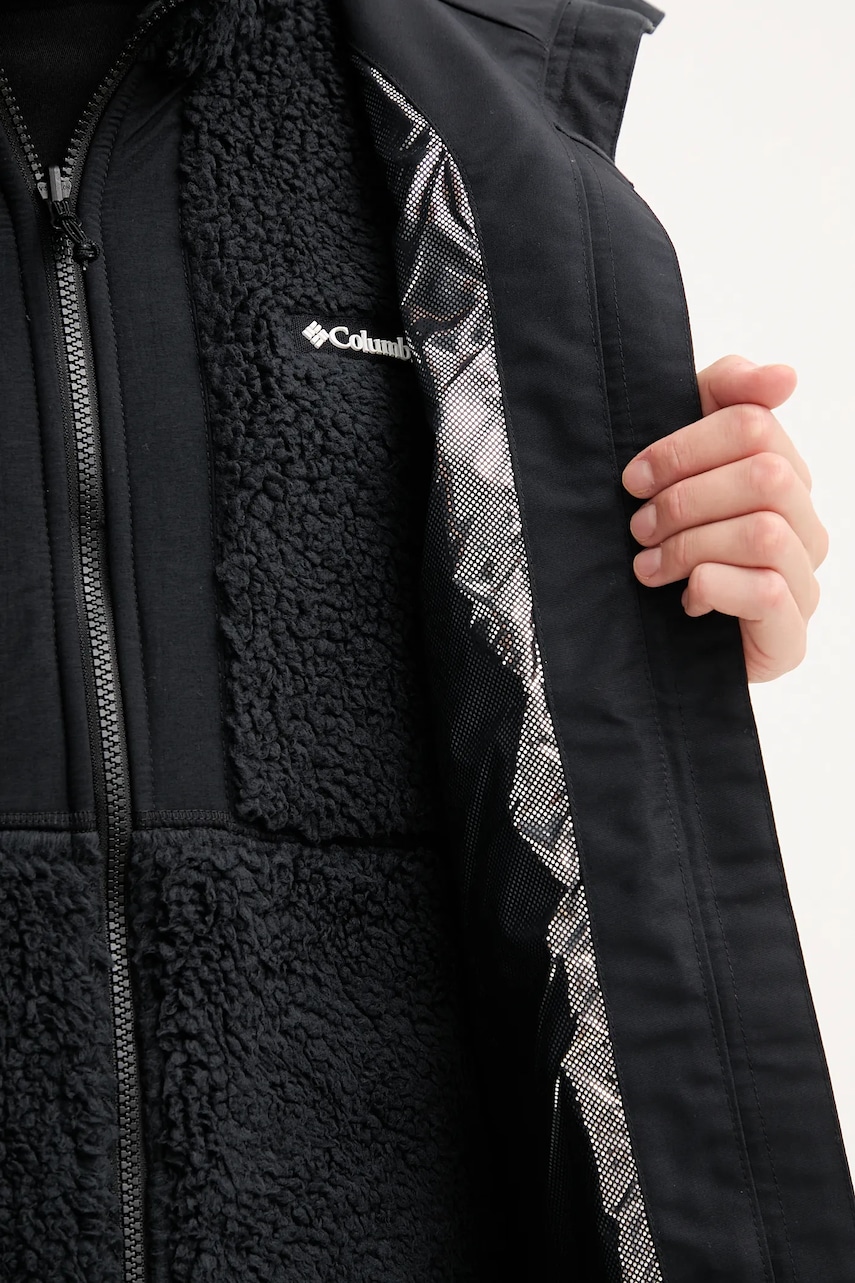 - Columbia Interchange to połączenie kurtki oraz polarowej podpinki, którą można nosić jako osobny model. - Model 2 w 1 składający się z dwóch warstw, które można nosić razem lub oddzielnie. Kurtka wierzchnia wykonana z materiału, który zapewnia wysoką wytrzymałość. Wyposażenie wierzchniej warstwy w wodoodporną membranę Omni-Tech® zapewnia także wysoką oddychalność, a uszczelnione szwy zwiększają ochronę przed niepogodą. Pod spodem bluza polarowa, stanowiąca warstwę docieplającą, wykonana z materiału gwarantującego wysoki komfort. - Wodoodporność oznacza podwyższoną odporność na działanie wody. Produkt w kontakcie z wodą zachowuje swoje właściwości, co pozwala na większy komfort użytkowania dzięki niższemu progowi przemakalności, nie gwarantuje jednak całkowitej wodoszczelności. - Warstwa materiału Omni-Heat Reflective™ pomaga utrzymać optymalny komfort termiczny poprzez odbijanie i zatrzymywanie ciepła wytwarzanego przez ciało. Jednocześnie doskonale odprowadza wilgoć z powierzchni skóry i rozprasza nadmiar ciepła, co pomaga zachować odpowiedni mikroklimat. - Dolne krawędzie rękawów z regulacją na zatrzaski. - Rozbudowany system kieszeni ułatwia bezpieczne przechowywanie drobiazgów. - Zapięcie na całej długości na suwak wyposażony w przypinaną na zatrzaski klapkę przeciwsztormową. - Podwyższony kołnierz gwarantuje dodatkową ochronę przed chłodem. - Wbudowany kaptur zapewnia dodatkowe ciepło i osłonę, gdy jest to potrzebne. - Dłuższy tył zapewnia osłonę podczas poruszania się. - Długość rękawa(mierzona od kaptura): 76 cm. - Szerokość pod pachami: 53 cm. - Wymiary podane dla rozmiaru: S. - Długość z przodu: 72 cm. - Długość z tyłu: 80 cm.