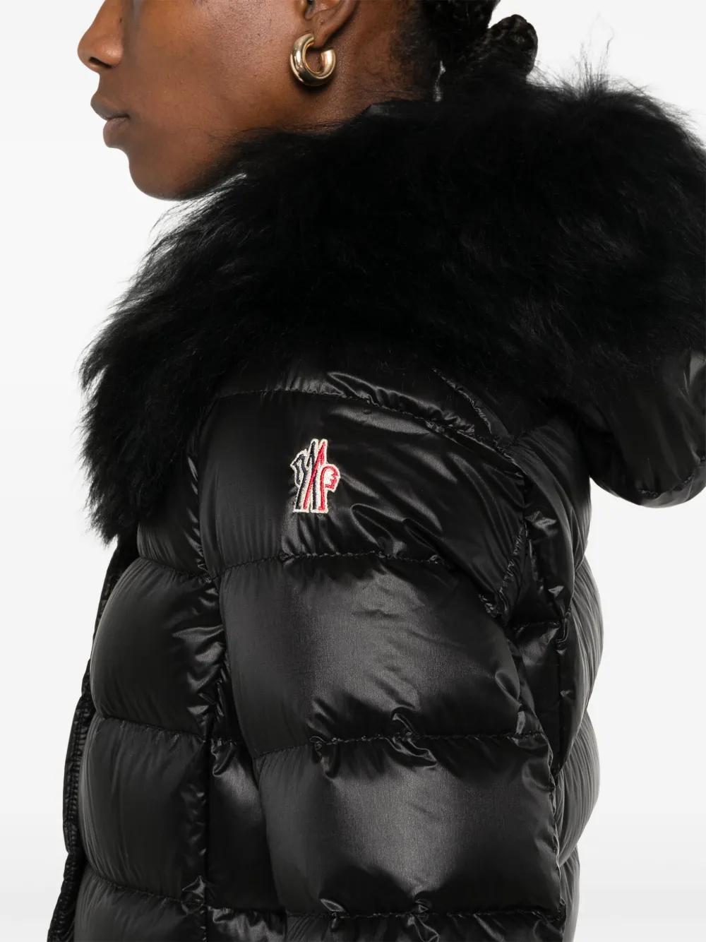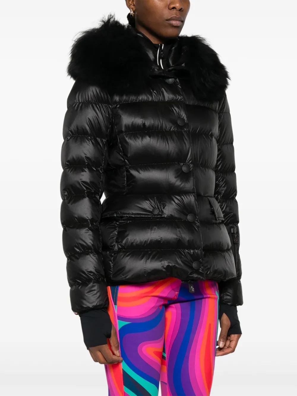 black water-repellent windproof insulated design padded design goose down-feather filling front two-way zip fastening front press-stud fastening classic hood detachable shearling trim to the hood funnel neck long sleeves logo patch at the sleeve sleeve pass zip pocket layered fitted-cuff with thumb slots two side press-stud fastening flap pockets full lining powder skirt elasticated waistband