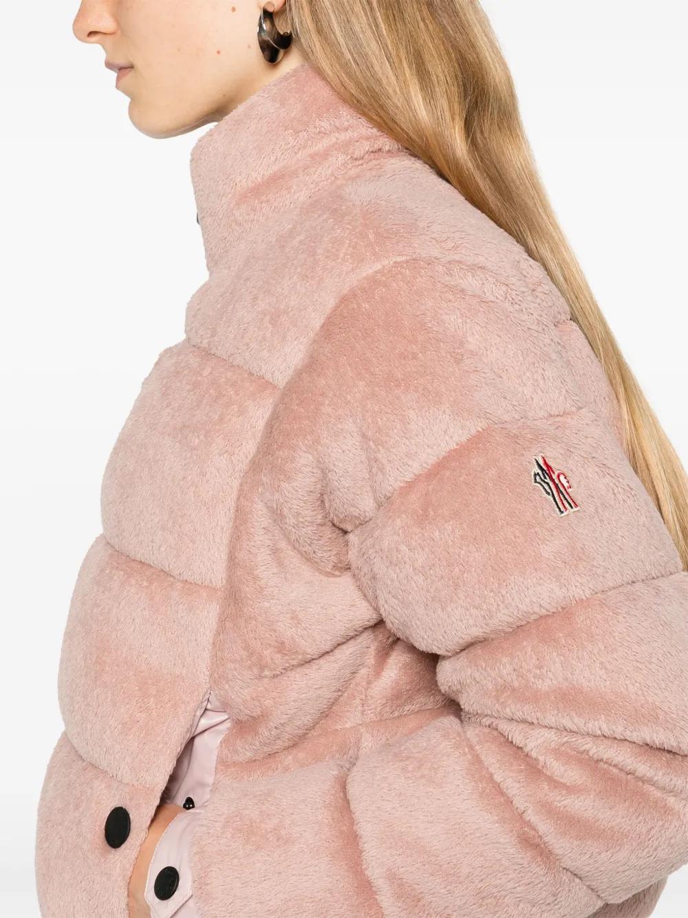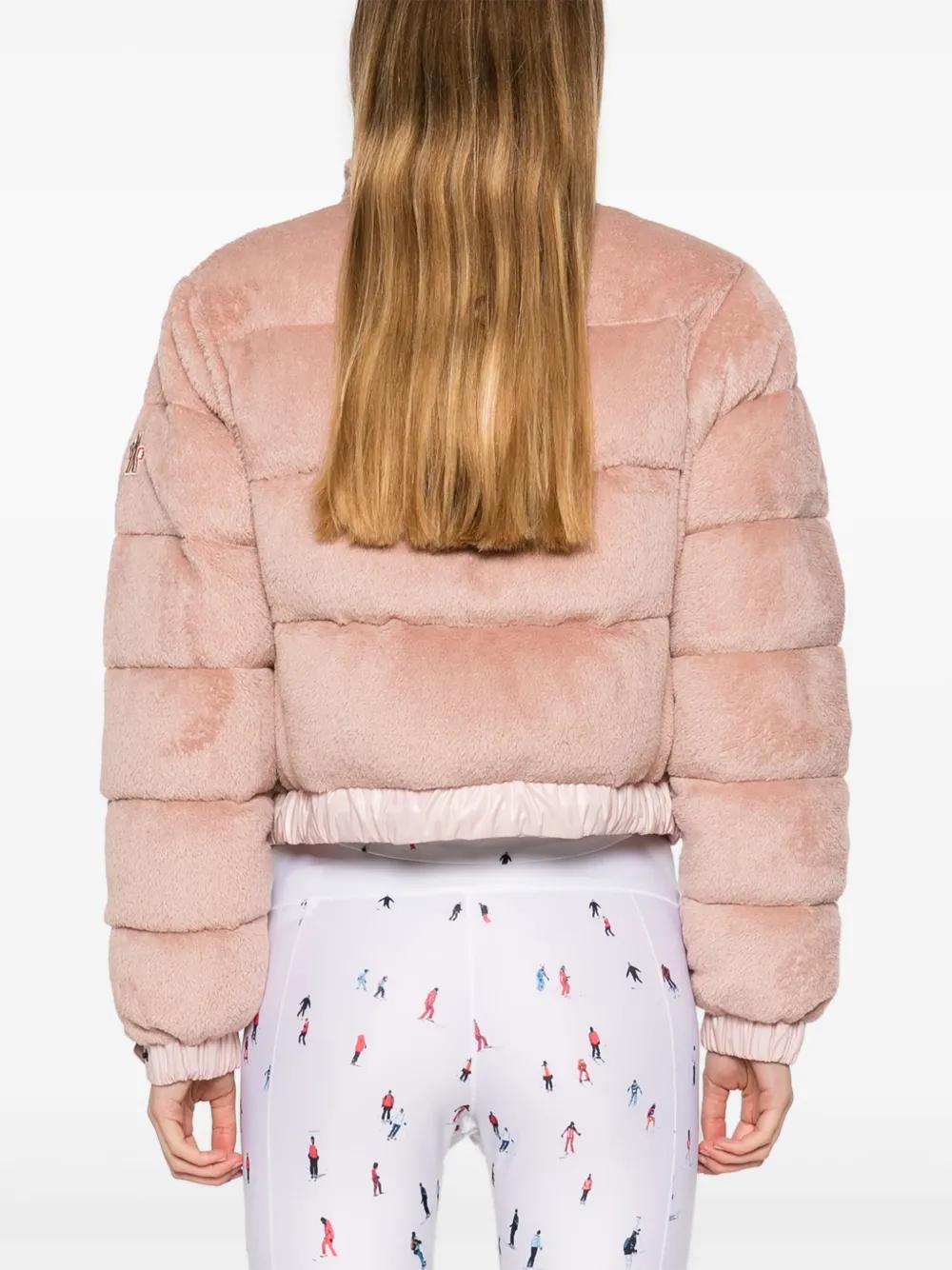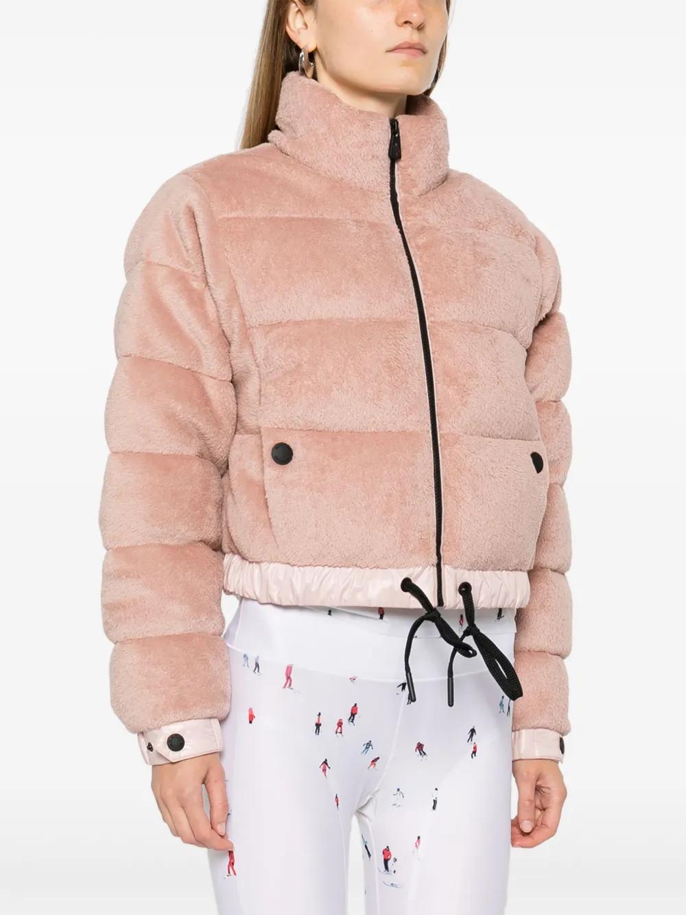 rose pink goose down padded design fleece texture front zip fastening high neck long sleeves with press-stud fastening cuffs embroidered logo at the chest two side stud-fastening pockets full lining drawstring hem cropped