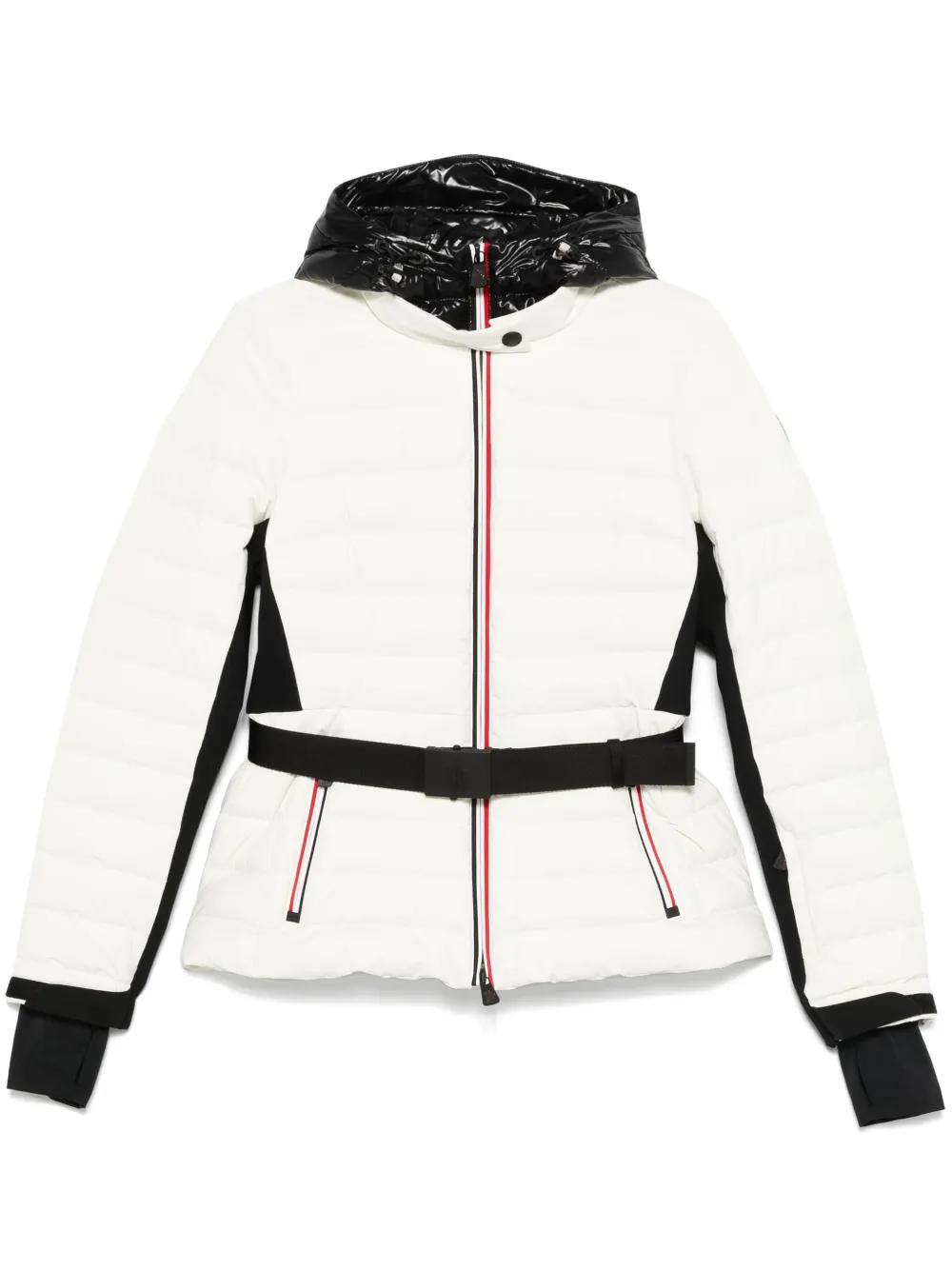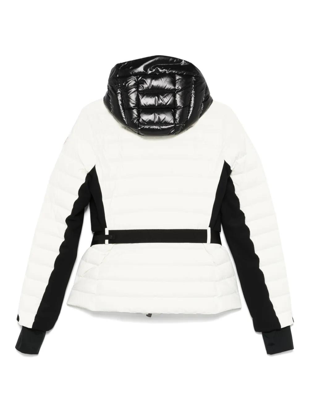 white/black down-feather filling padded design quilted water-repellent windproof insulated design colour-block design front two-way zip fastening drawstring hood funnel neck long sleeves logo patch at the sleeve touch-strap cuffs thumb slots belted waist two side zip-fastening pockets full lining elasticated hem