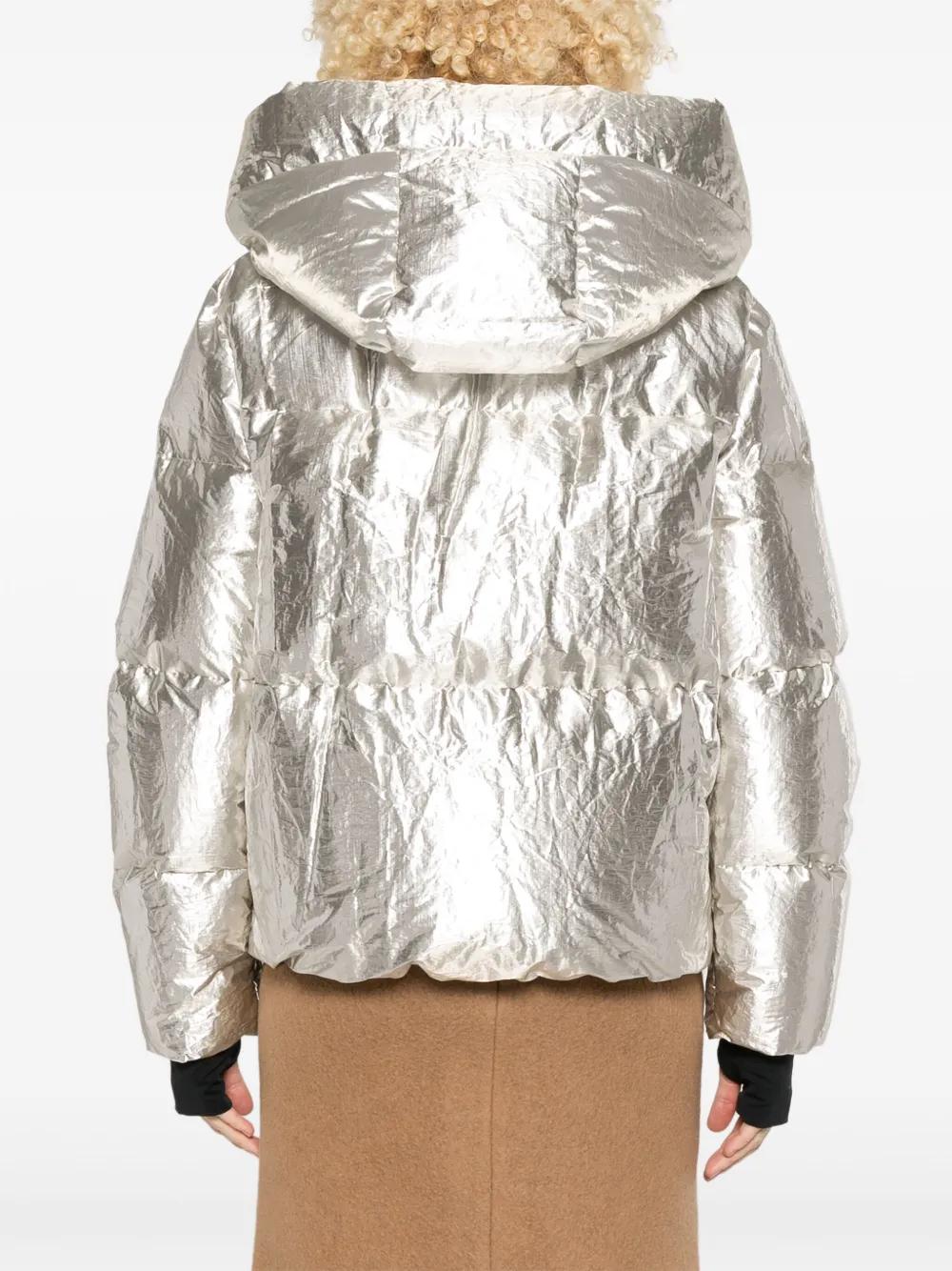 silver-tone down-feather filling lamé effect insulated design padded design water-repellent and windproof quilted finish shearling trim front two-way zip fastening classic hood stand-up collar logo patch at the sleeve long sleeves with thumb slot two front patch pockets full lining internal zip-fastening pocket powder skirt elasticated hem