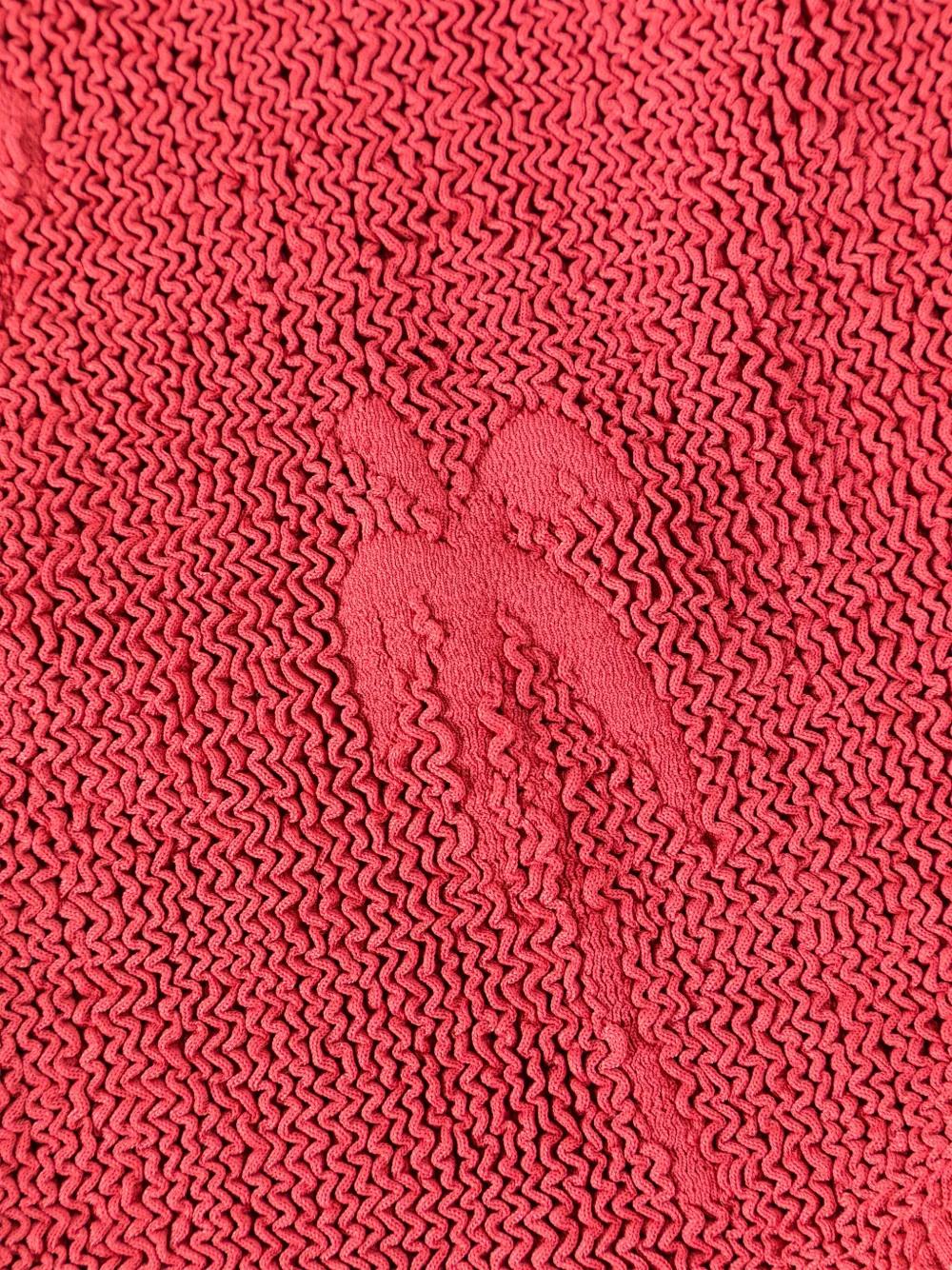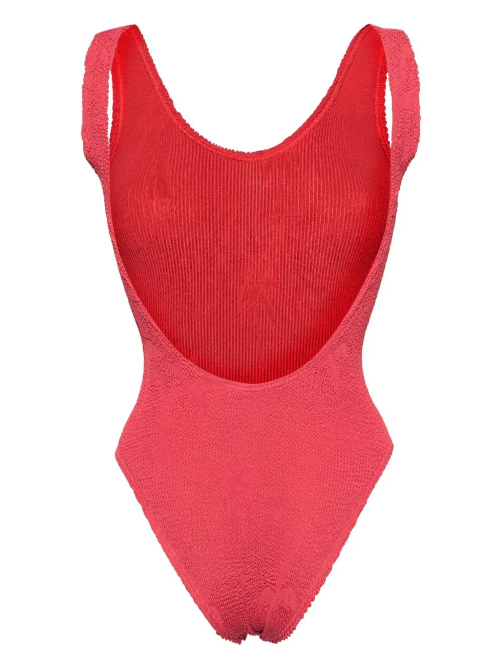 light red stretch-design seersucker texture palm tree pattern scoop neck sleeveless open back high cut Be mindful to try on swimwear over your own garments.