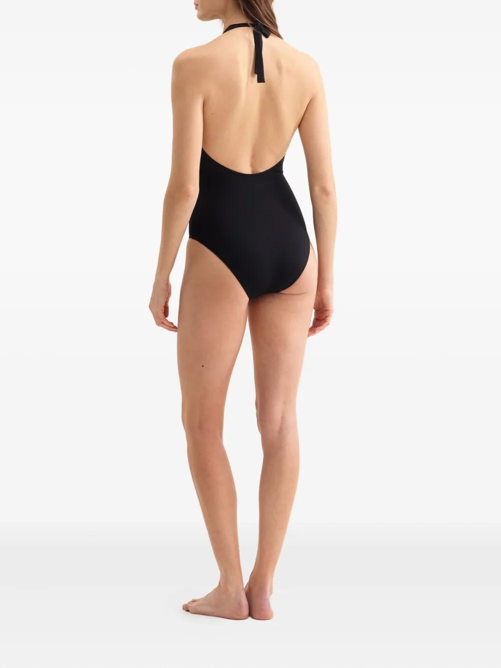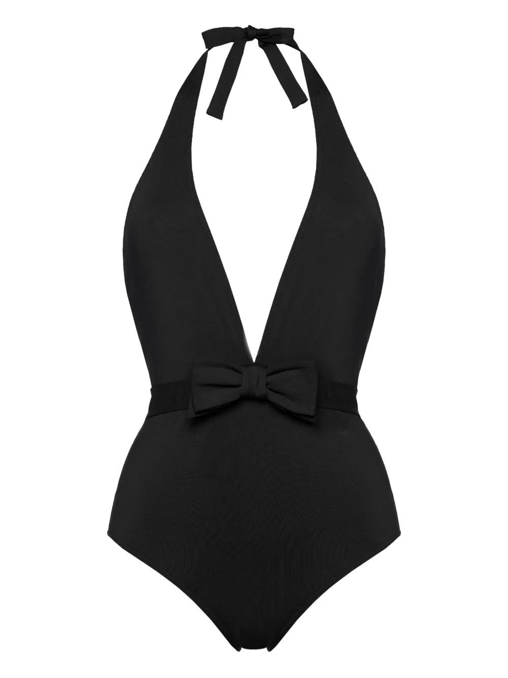 black halter neck plunging neckline bow detail low back high-leg cut Be mindful to try on swimwear over your own garments.