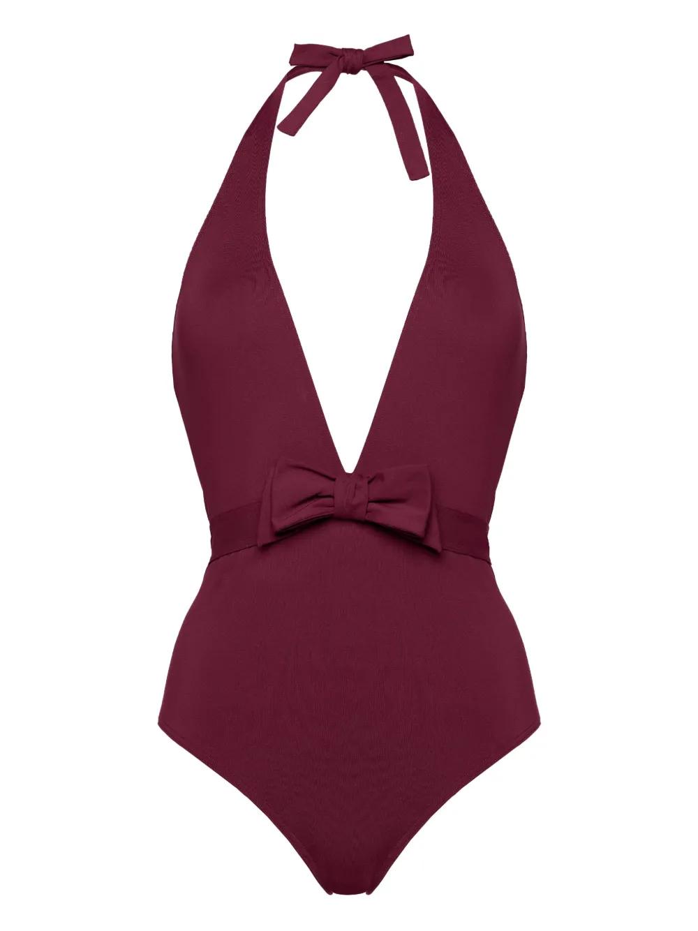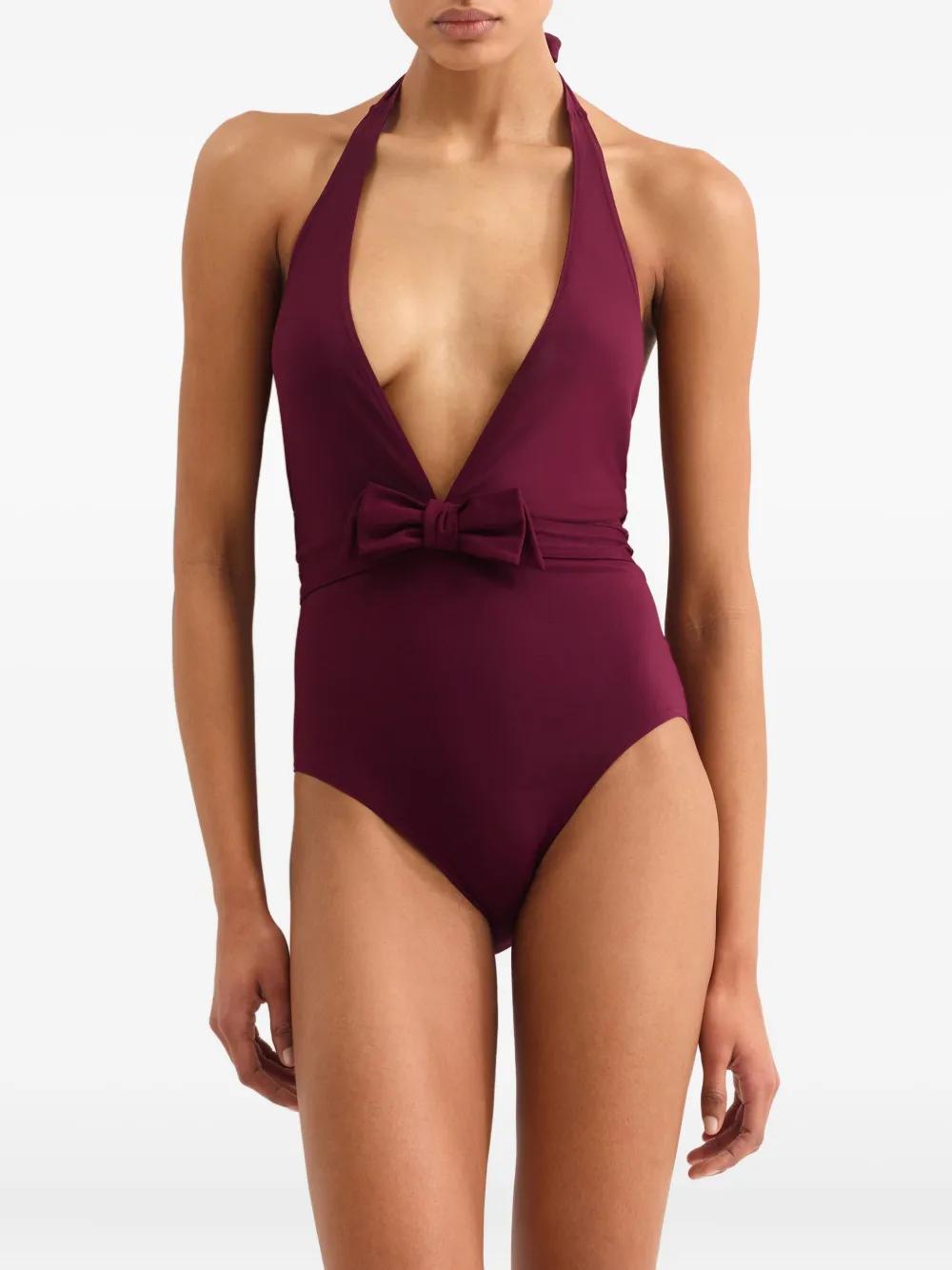 purple halter neck bow detail open back high-leg cut Be mindful to try on swimwear over your own garments.