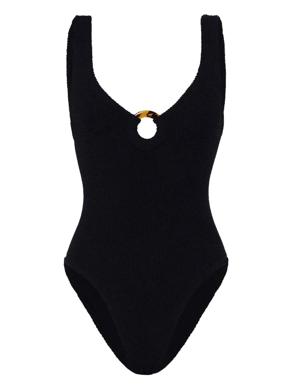 black tortoiseshell ring detail V-neck sleeveless high-leg cut Be mindful to try on swimwear over your own garments.