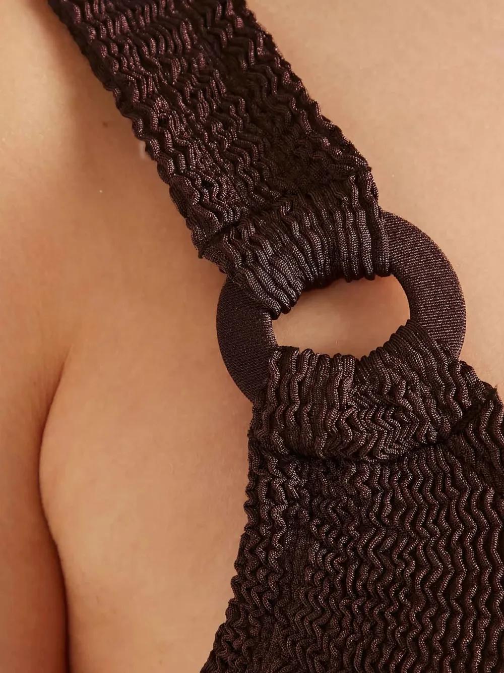 brown textured fabric scoop neck low scoop back tonal hoop detailing Be mindful to try on swimwear over your own garments.