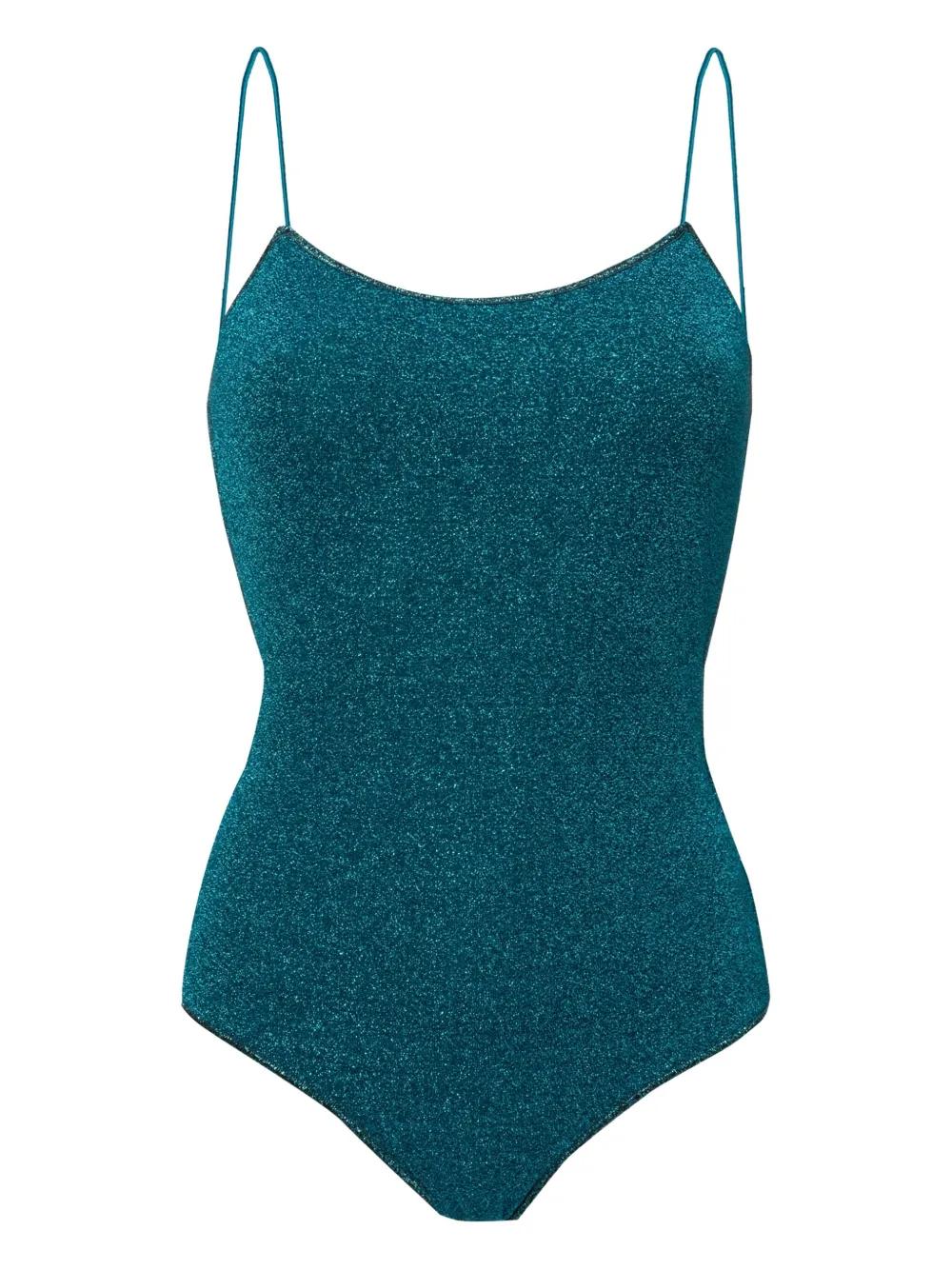 ocean blue glitter finish spaghetti straps scoop neck low back Be mindful to try on swimwear over your own garments.