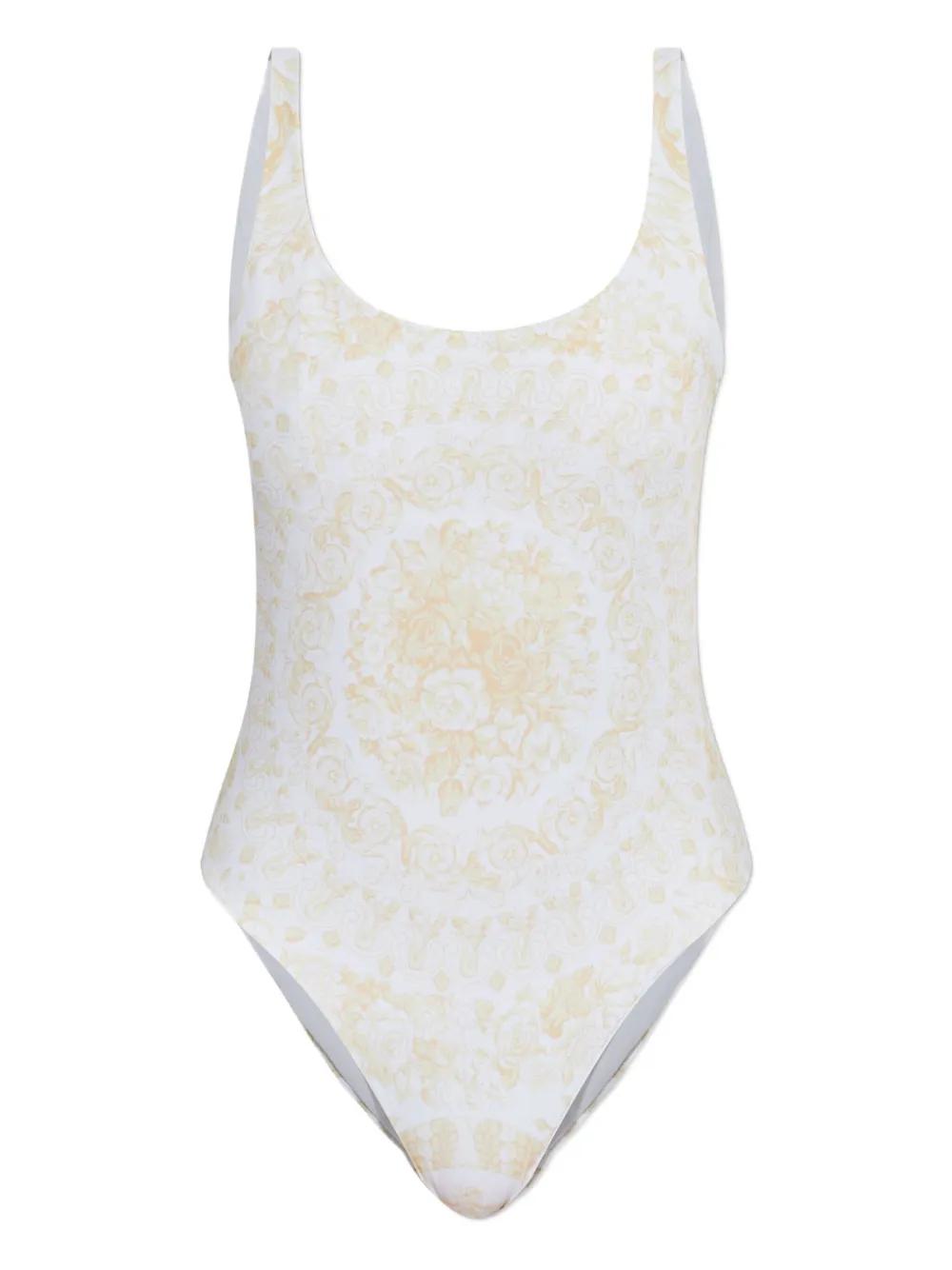 white and beige floral print scoop neck sleeveless scoop back Be mindful to try on swimwear over your own garments.
