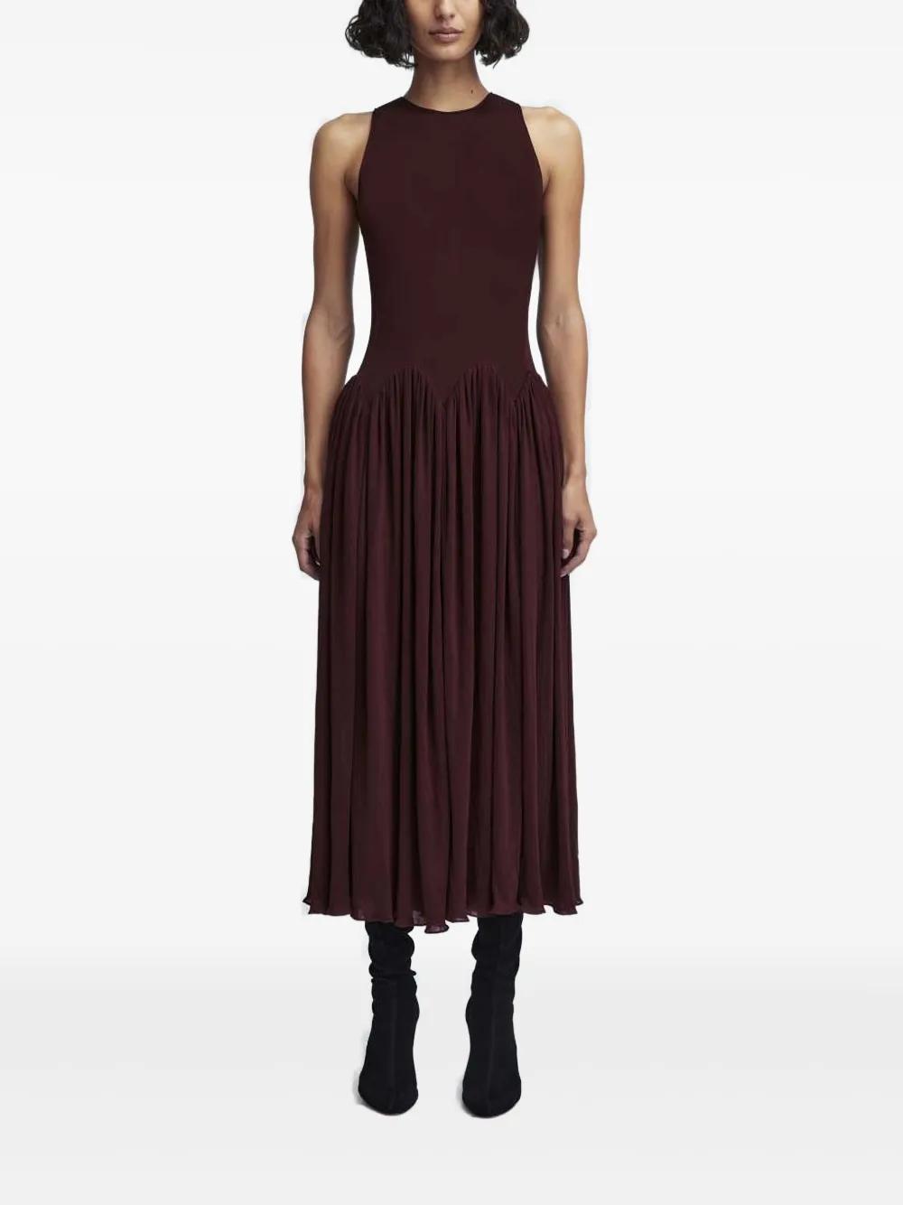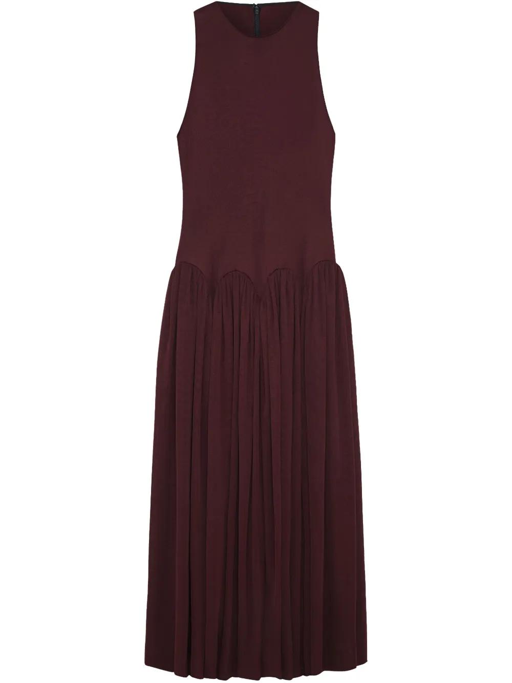 dark red gathering at the hip concealed rear zip fastening flared skirt sleeveless round neck