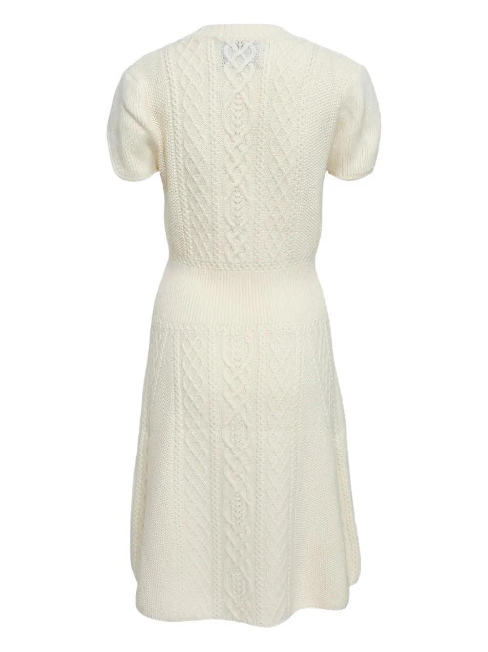 beige wool cable knit short sleeve round neck a-line skirt fitted waist