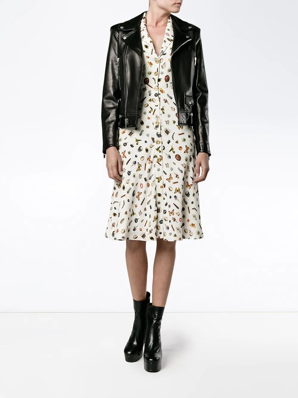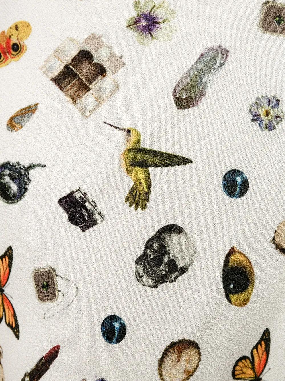 White and multicolour silk Obsession print shirt dress from Alexander McQueen featuring a notched collar, a v-neck, short sleeves, a front button fastening, a fitted waist, a flared style, a godet hem and a mid-length.