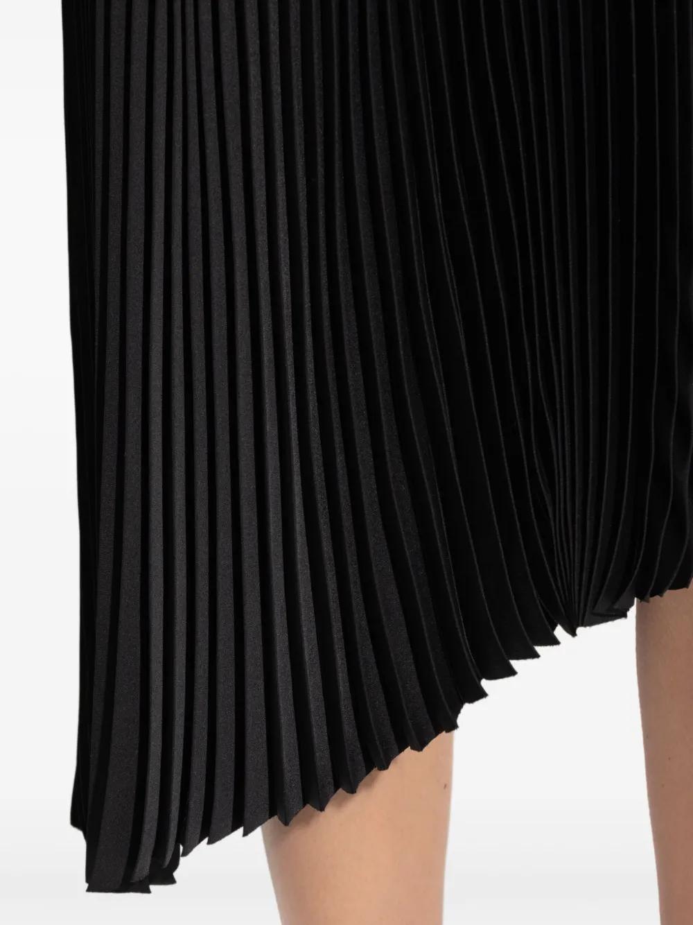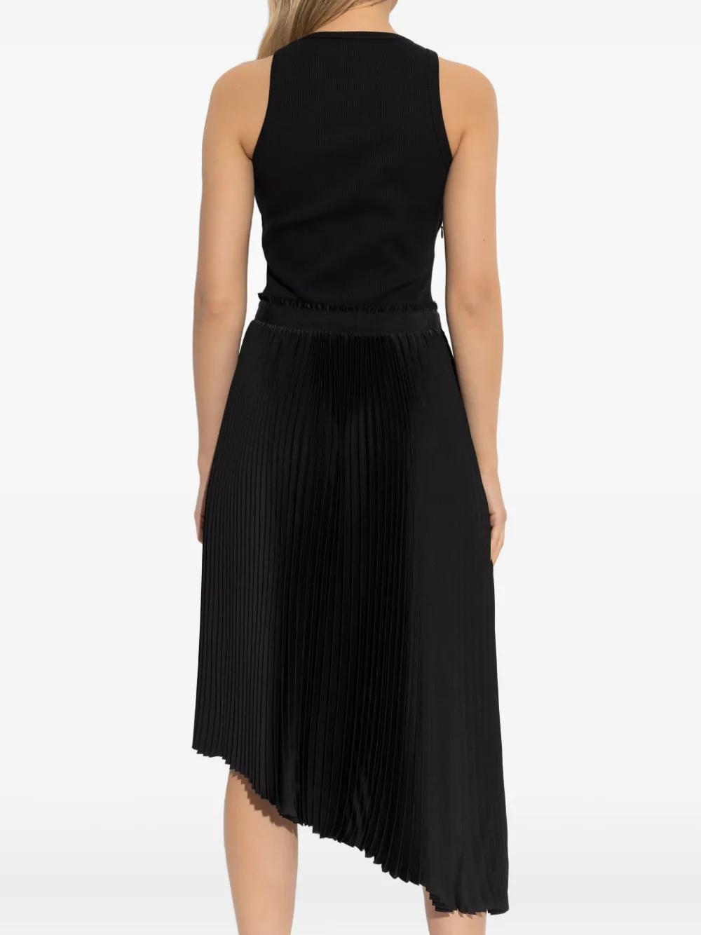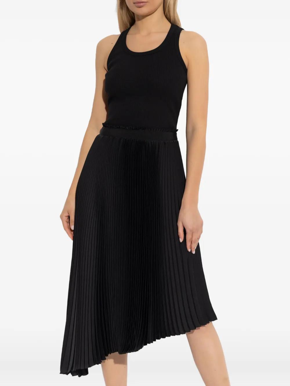 black pleated skirt asymmetric hem sleeveless bodice round neck ribbed top