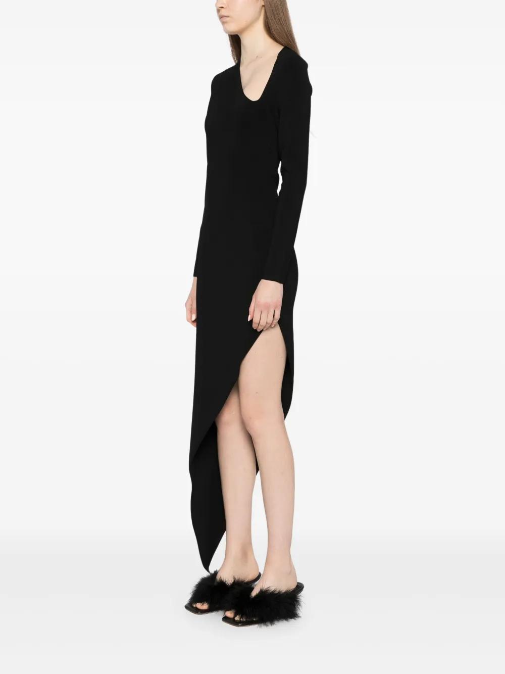 black stretch-design fine ribbed pull-on style asymmetric neck long sleeves asymmetric hem