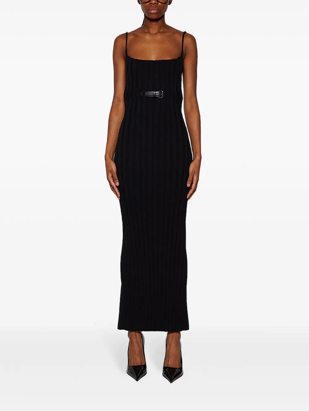 black stretch-design chunky ribbed knit bodycon design square neck belted waist spaghetti straps open back rear slit long length