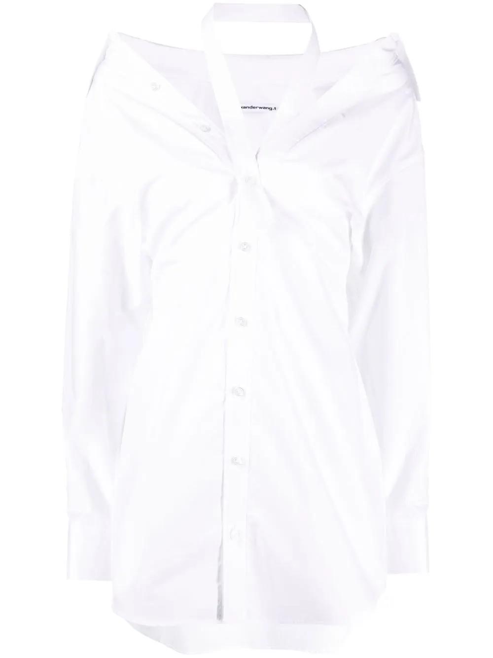 white cotton off-shoulder front button fastening long sleeves buttoned cuffs curved hem