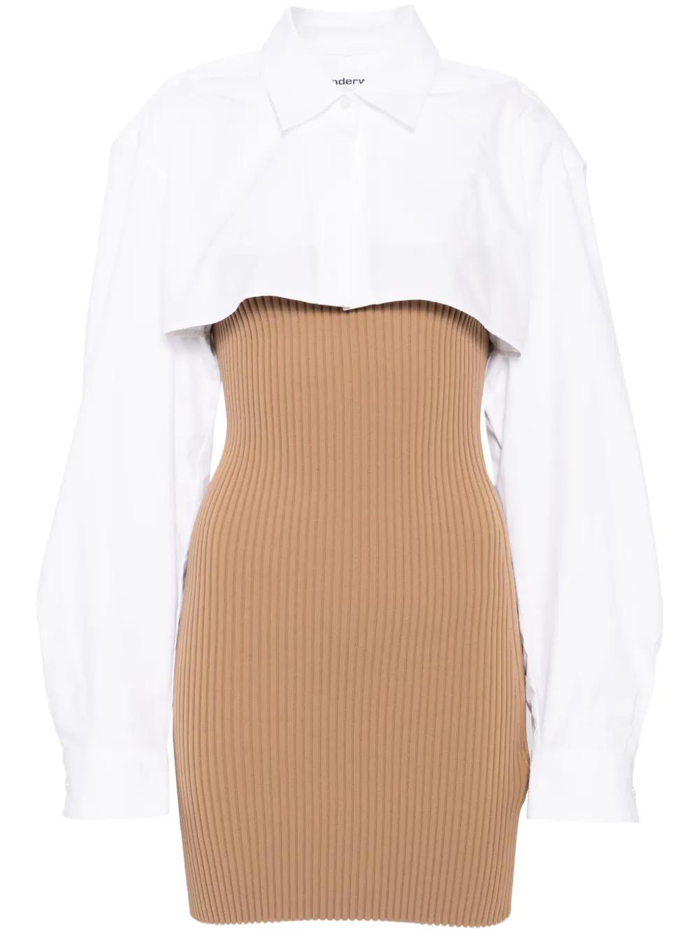 camel brown/optical white stretch-design layered design ribbed knit classic collar front button fastening drop shoulder long sleeves buttoned cuffs straight hem thigh-length