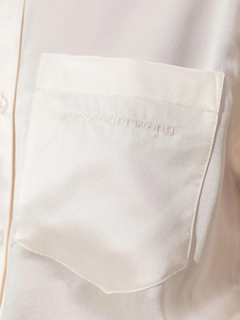 white silk front button fastening ruffled asymmetric hem long sleeves chest patch pocket