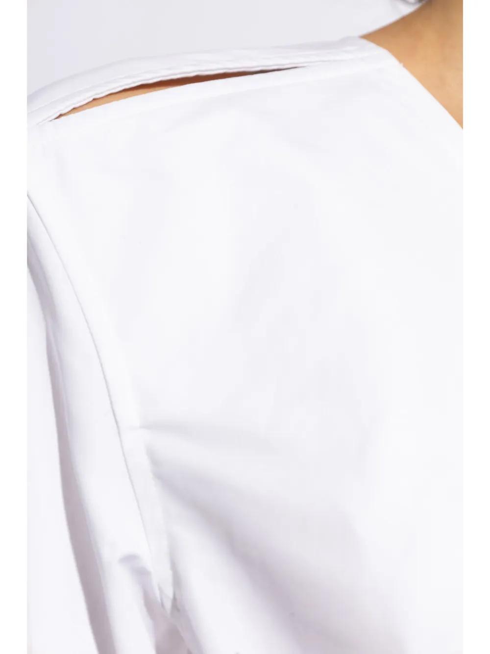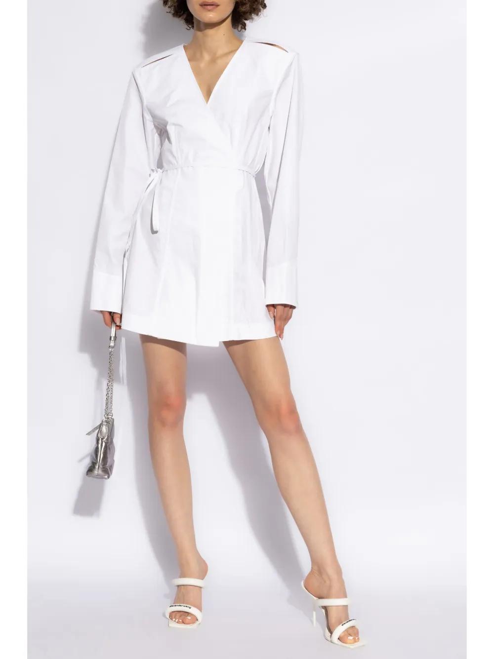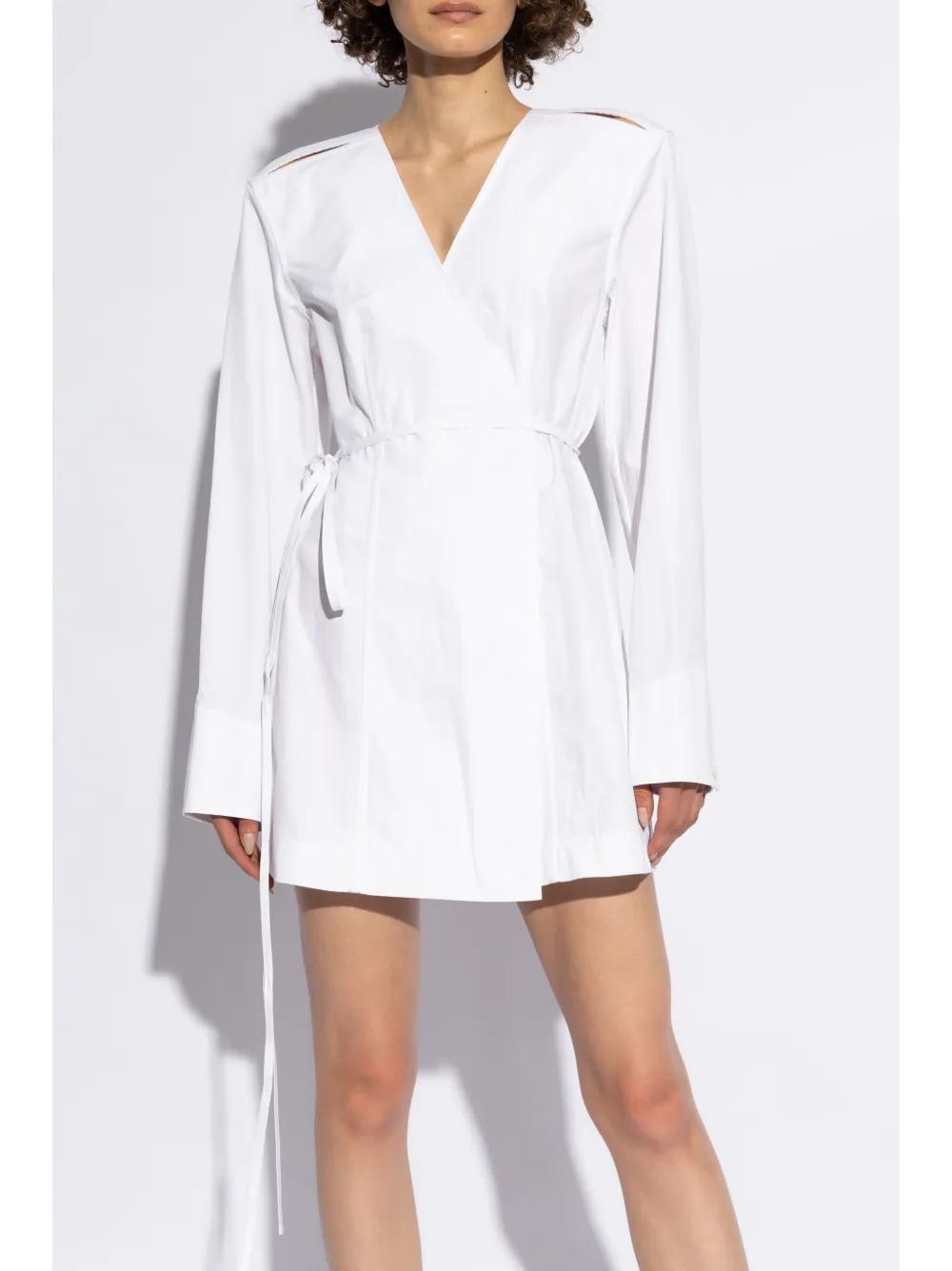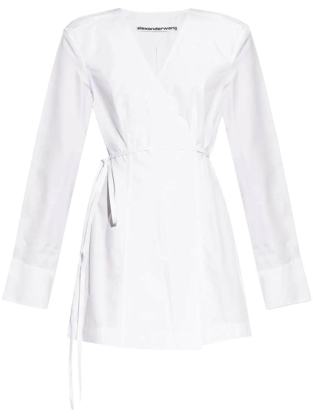white organic cotton embroidered logo at the sleeve slit detailing dart detailing wrap design V-neck long sleeves buttoned cuffs tie-fastening straps straight hem