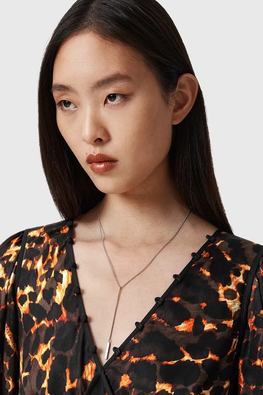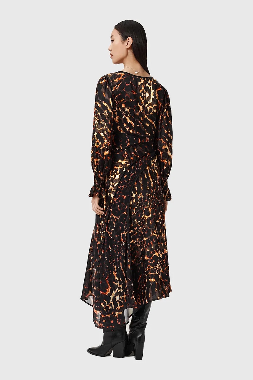 AllSaints sukienka z dodatkiem jedwabiu kolor brązowy midi rozkloszowana W102DD
