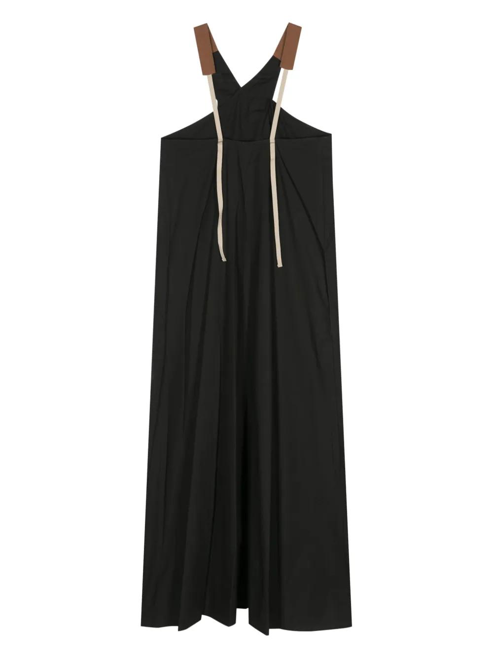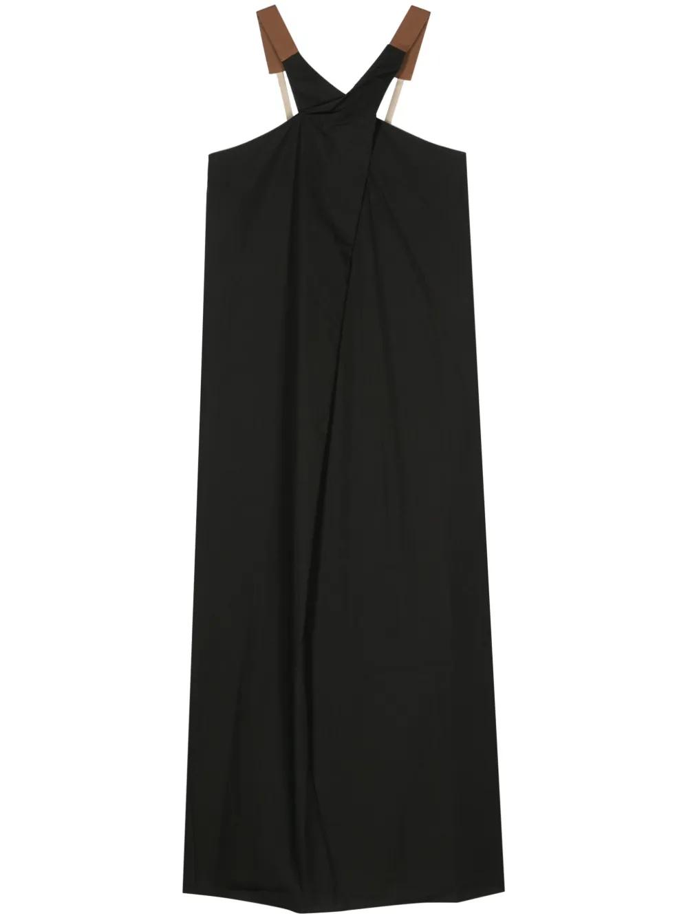 black cotton poplin texture contrasting grosgrain ribbon thin straps crossover strap detail to the front V-neck sleeveless two side inset pockets mid-length straight hem pull-on style